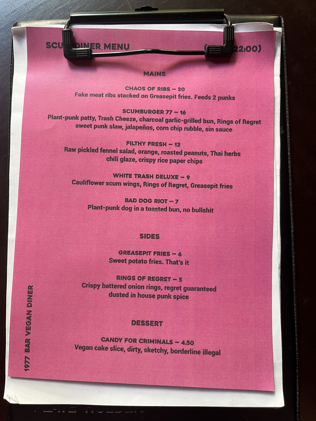 We came here for a lunch on a Saturday not having realised that the diner food is only served from 5 pm. They had some cakes available, but since we were drinking alcohol, we didn’t want to mix it and so we didn’t get to experience the food. However, having seen the menu it’s mainly bar food, heavily based on meat and cheese substitutes. The place itself and it’s vibe I really liked. Would be interesting to see what it’s like when it’s busy. The neighbourhood I wasn’t so keen on and wouldn’t normally be in the vicinity. The person behind the bar was new and overwhelmed, which made for a funny experience at least. The food was all vegan as far as I could see, but they do offer cows milk for the hot drinks.