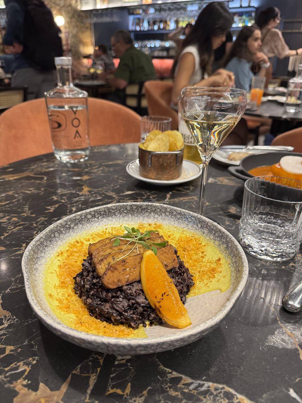 For my main I got a dish with Rainy in the title (notas de chuva in Portuguese). It was tempeh on black rice and I’ve never had anything like it. There was coconut milk and an orange and it wouldn’t necessarily be something that sung to me but I took a risk and loved every bite. My partner got the Francesinha which was a seitan sandwich drenched in a savoury red sauce with an “egg” on top. Was it It was rich and smoky, she didn’t love it but mostly because she overstuffed herself on the appetizer and nothing is appealing when you’re that full.