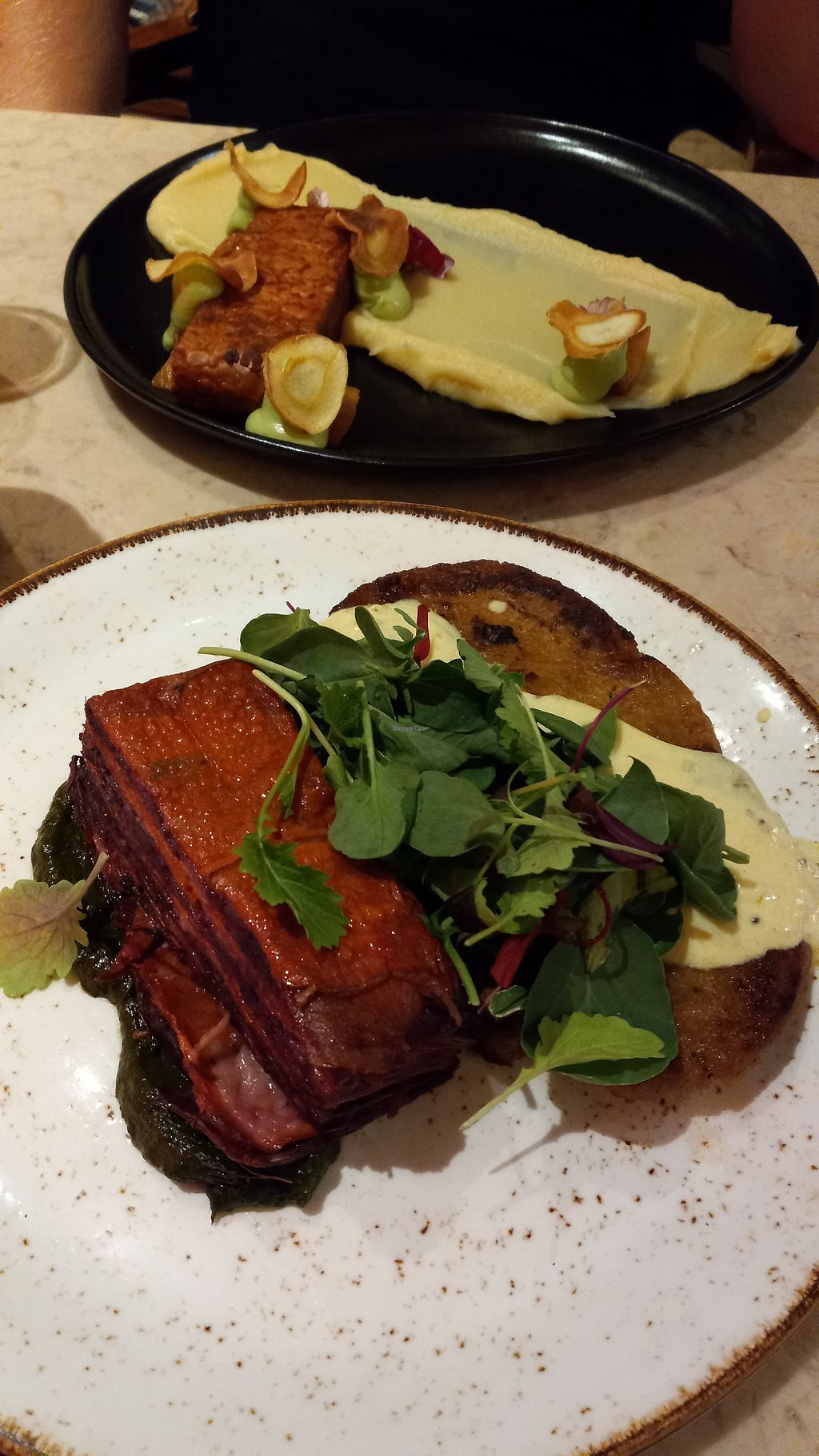 Read morePara prato principal pedi bife de seitan e o meu namorado o tofu à lagareiro! Estava tudo maravilhoso, sabor umami tudo ótimo temperado! O seitan ótimo com o picante do molho, o doce do mil folhas e a acidez do espinafre! O à lagareiro estava ótimo muito equilibrado, só sentimos falta de sal no tofu pois normalmente o bacalhau tem um toque mais salgado e mais sal no tofu elevava o prato. Mas tudo maravilhoso recomendo imenso mesmo!