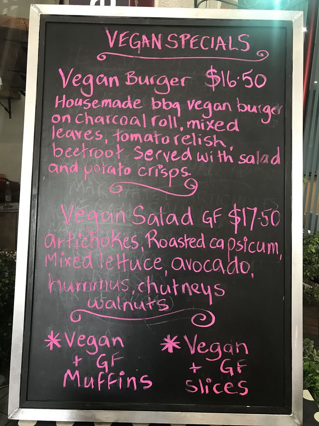 They a salad, a vegan burger, vegan breakfast, mushrooms on toast and daily vegan muffins for sale. Occasionally they have vegan options on their daily specials.