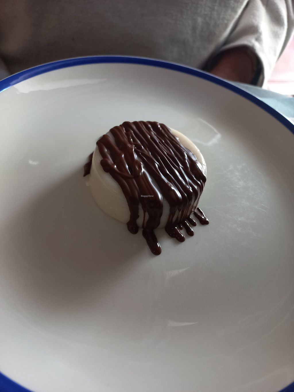 Dessert was light and delicious I had BIANCOMANGIARE AL LATTE DI MANDORLA CON SALSA DI PESCHE. SCIROPPATE Vegan panacotta made with almond milk and topped with peach sauce, and my partner BIANCOMANGIARE AL LATTE DI MANDORLA CON CIOCCOLATO which was topped with chocolate sauce.
