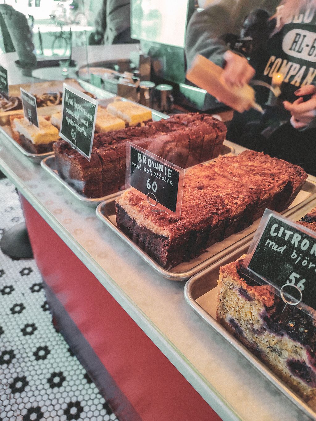 I couldn't resist the (very good and crisp) Toast Skagen (new years special) 110 sek and a hot Matcha latte 62 sek. To top it off with something sweet a chocolate coconut tosca brownie, which was also heavenly.