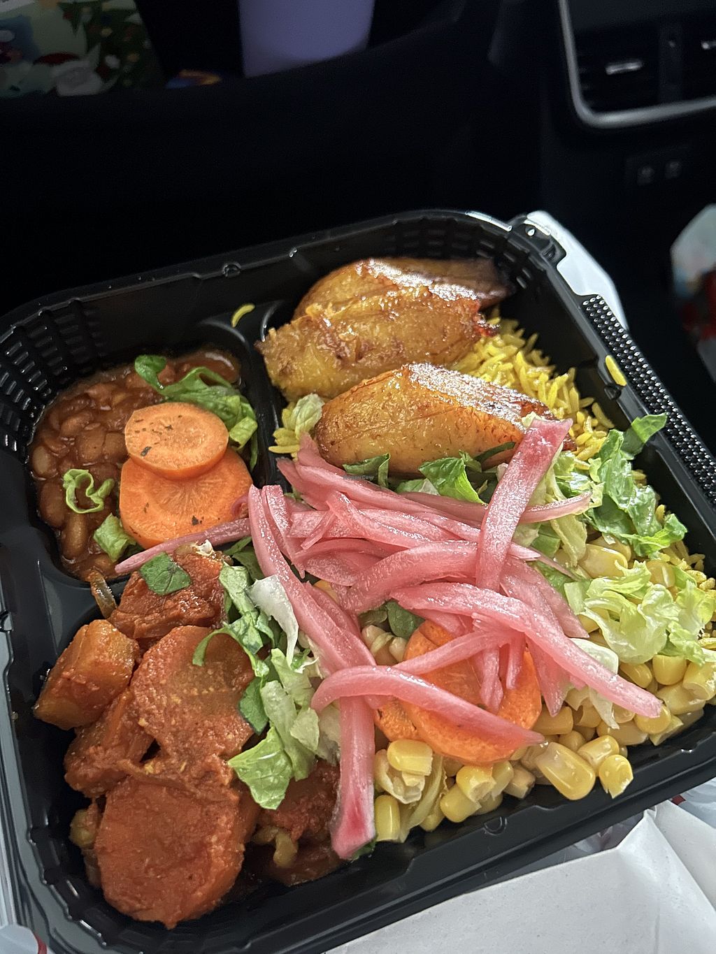 Vegan options include a plate/bowl with rice, protein and veggies. Both types of rice were vegan and the protein options included beans and a mix of veggies and peas in tomato sauce. As add-ons, they had plantains. Everything was delicious and the staff seemed knowledgeable of the vegan options available. However, I wish they had informed us of what was included in the price while serving. Plantains cost extra, but are worth it!