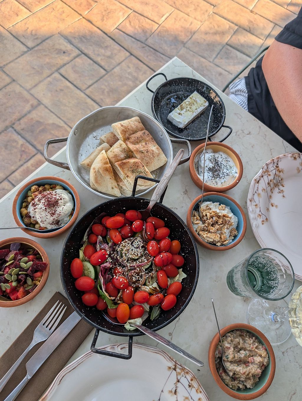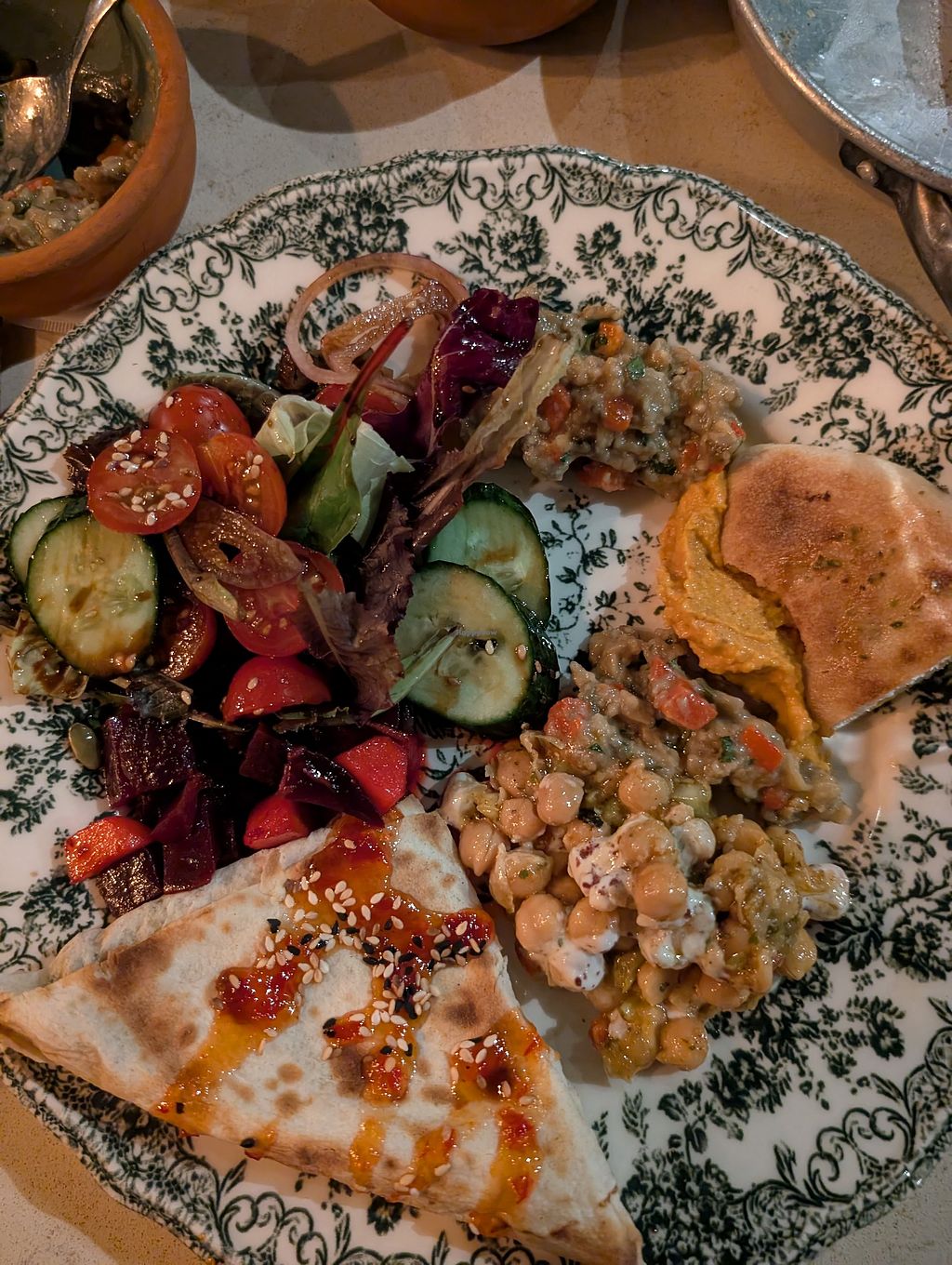 Dishes included: potatoes, curried chickpeas, salad, couscous, grilled olives/tomatoes, pickled beetroot/apple, pita bread, filled tortilla, etc.