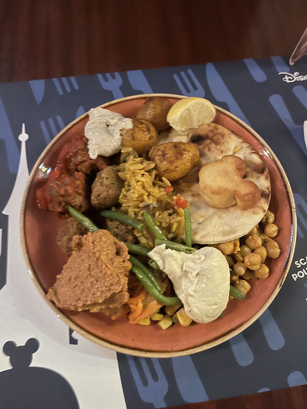 A great amount of food for vegetarian and vegans. It was yummy and perfect in a place like Disney. Hummus, olives, lentil salads, bean salads, Vege curry, could cousins etc. reasonably priced too.