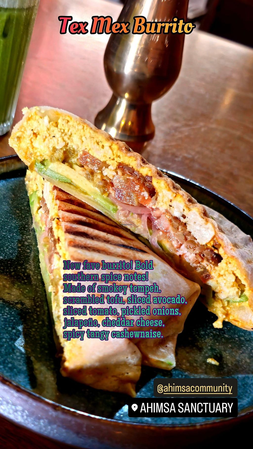 Ahimsa sanctuary really lives out its values! No mock meats here, just tasty wholefoods cooked in dishes with imagination and use of spices and herbs to flavour. We had a burrito filled with kale, vegan pesto, sweet potato and tempeh with was very tasty. Has indoor and covered outdoor seating as well as takeaway options. Uses fans to keep diners cool - it's 31 degrees today and we are just right! Lovely staff and clean bright premises and toilet. We might just be back for breakfast...