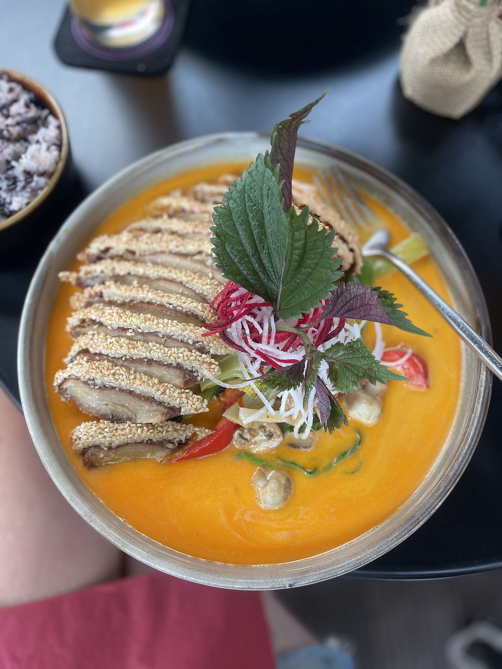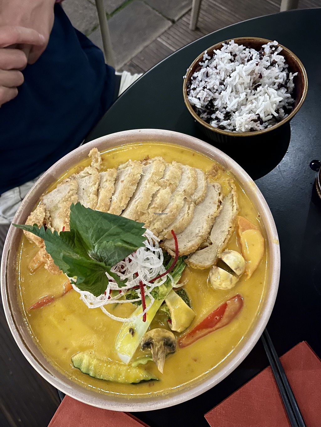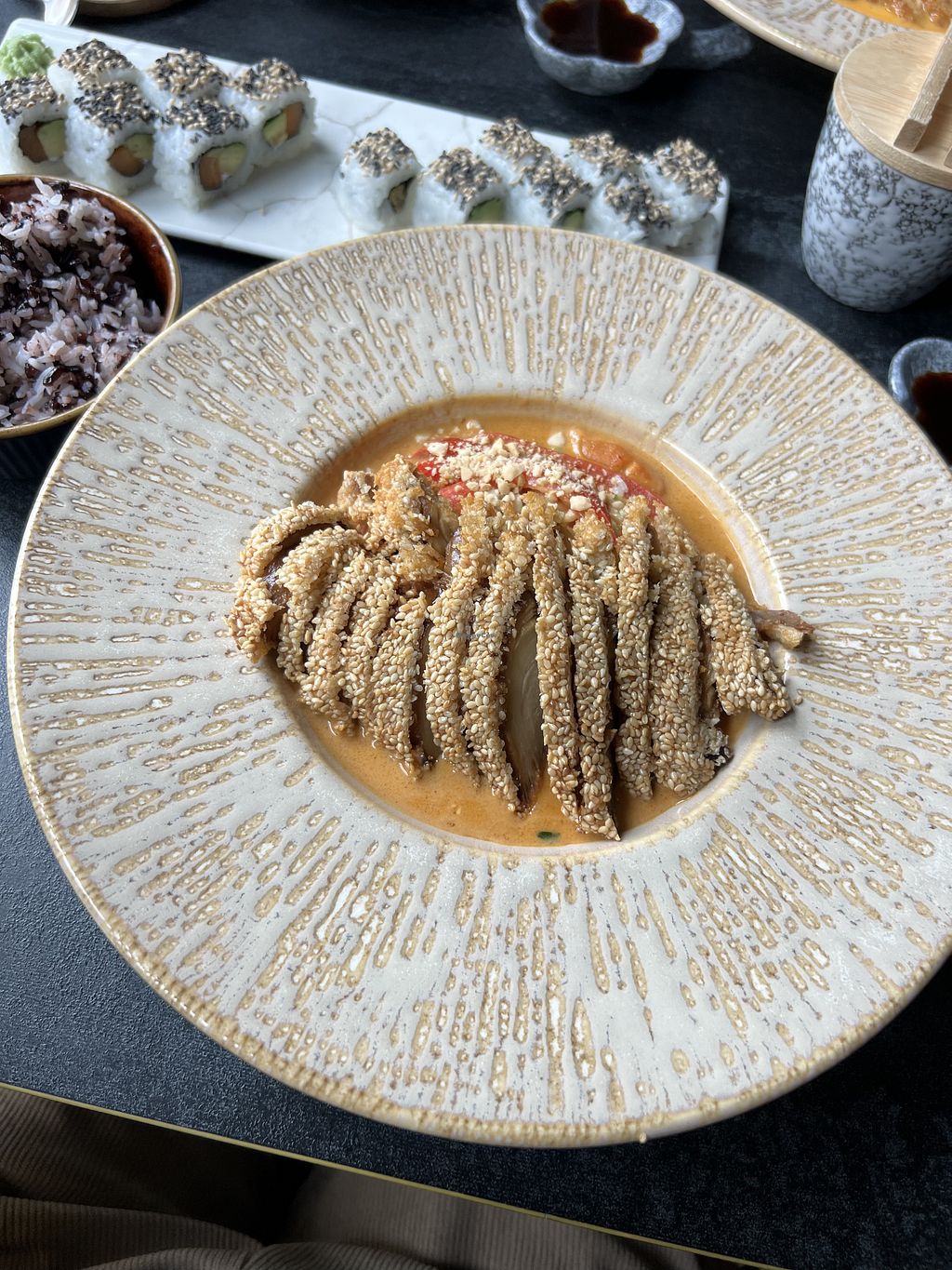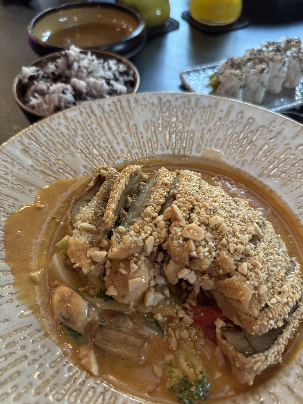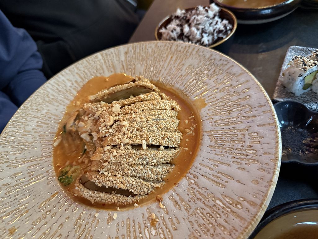 Read moreWir hatten die vegane Ente mit Reis und Erdnusssauce und das vegane Chicken mit Reis und Curry sowie Sushi. Alles perfekt abgeschmeckt und sehr schön angerichtet.