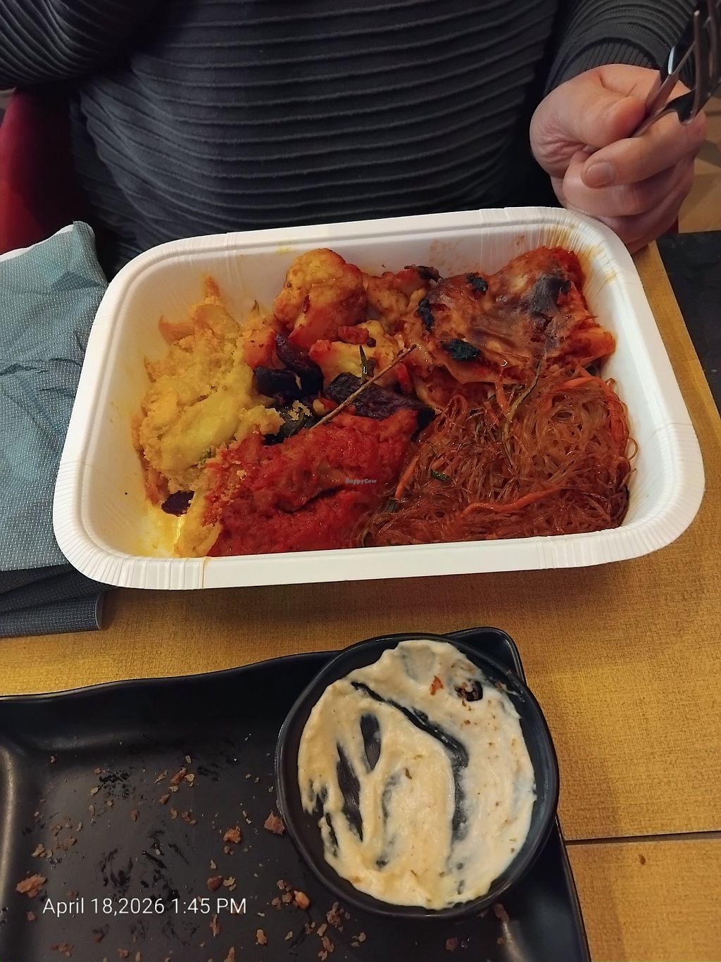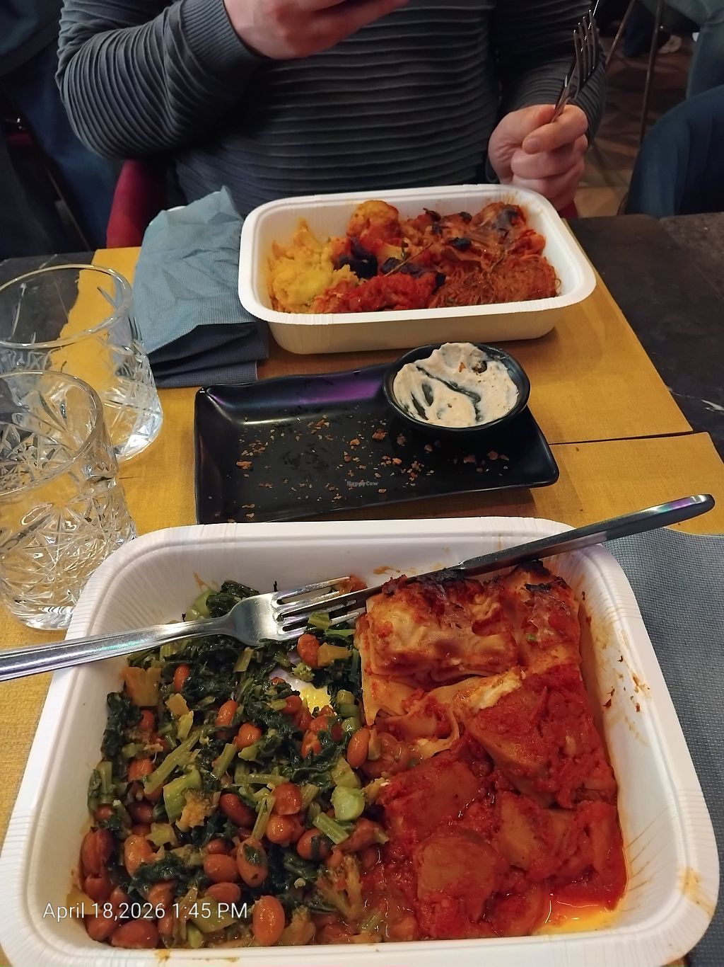 Everything is vegan and I could choose what I wanted to eat. They heat it up afterwards. On the first day, I was there at 7pm, when they opened the restaurant. So my food was warmed up well. On the second day, we were there at 9pm and they were extremely busy, so unfortunately, the food was cold. I don't want to eat cold food for dinner, so I asked them to heat it up for longer. It was then luke warm. I would recommend being there earlier. My friends really loved the lasagne and the tiramisu.