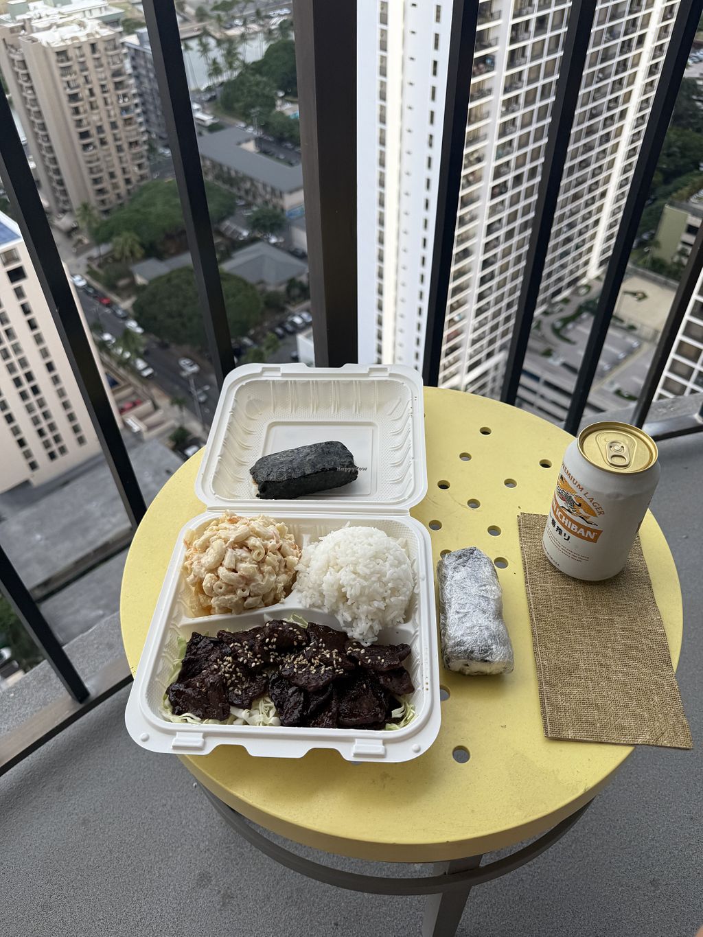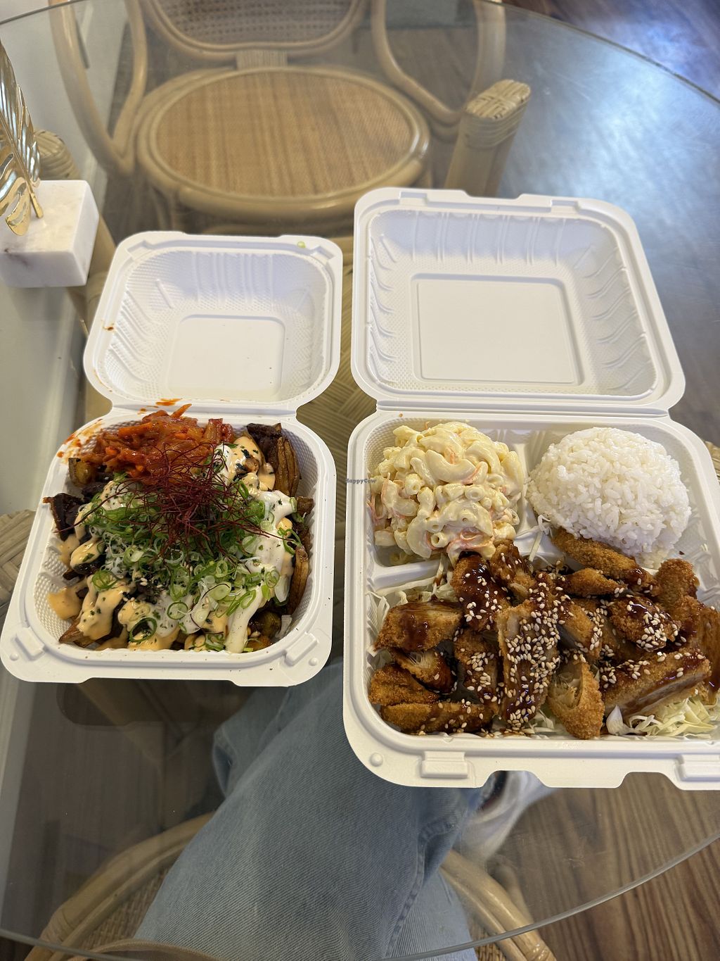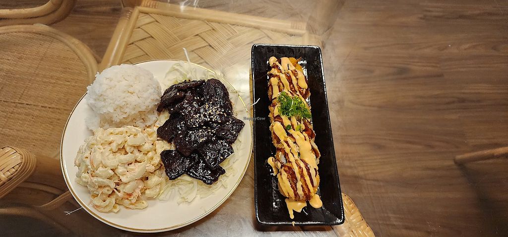 I'm almost speechless at how good this meal was! Ordered extra thinking we'd have leftovers but everything was so good that we ate it all. The musubi was so good, great thick vegan spam. Delicious kalbi meat with rice and mac & cheese, yummy roll, and fresh kimchi fried rice. 100% favorite meal in honolulu!