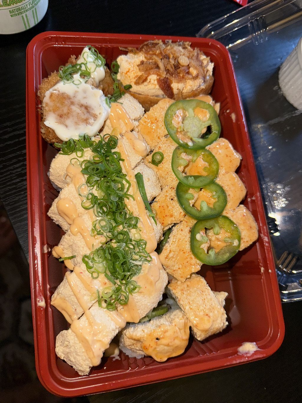 Tried a whole bunch of items via doordash delivery: spam musubi, chicken katsu, kimchi bulgogi fries, croquettes, and a bunch of sushi. Everything was delicious. The meat substitute were really good--no offputting textures and everything was well seasoned. Great "meat"-to-rice ratio on the musubi, katsu was thin and crunchy, kimichi was bright and crisp. Was craving local style comfort food and this really hit the spot.