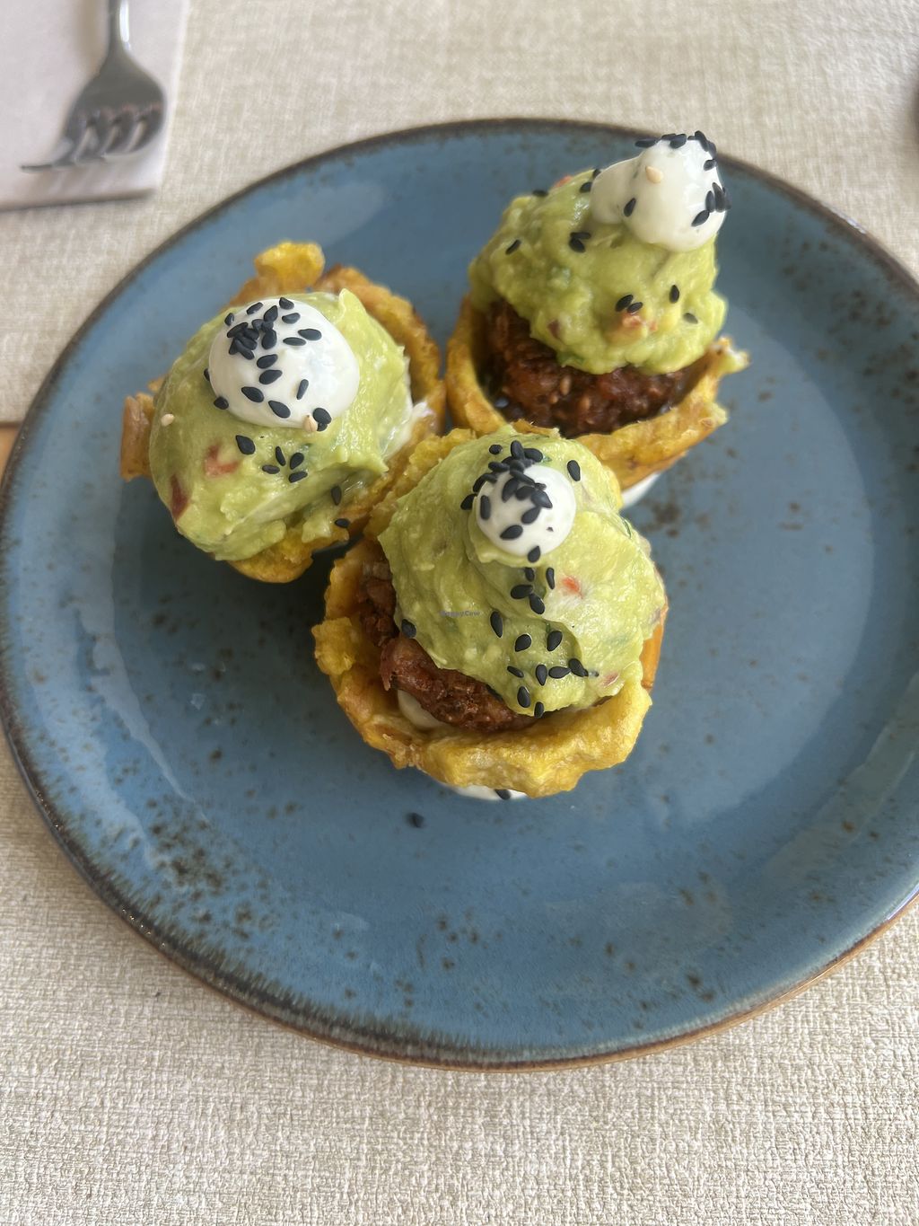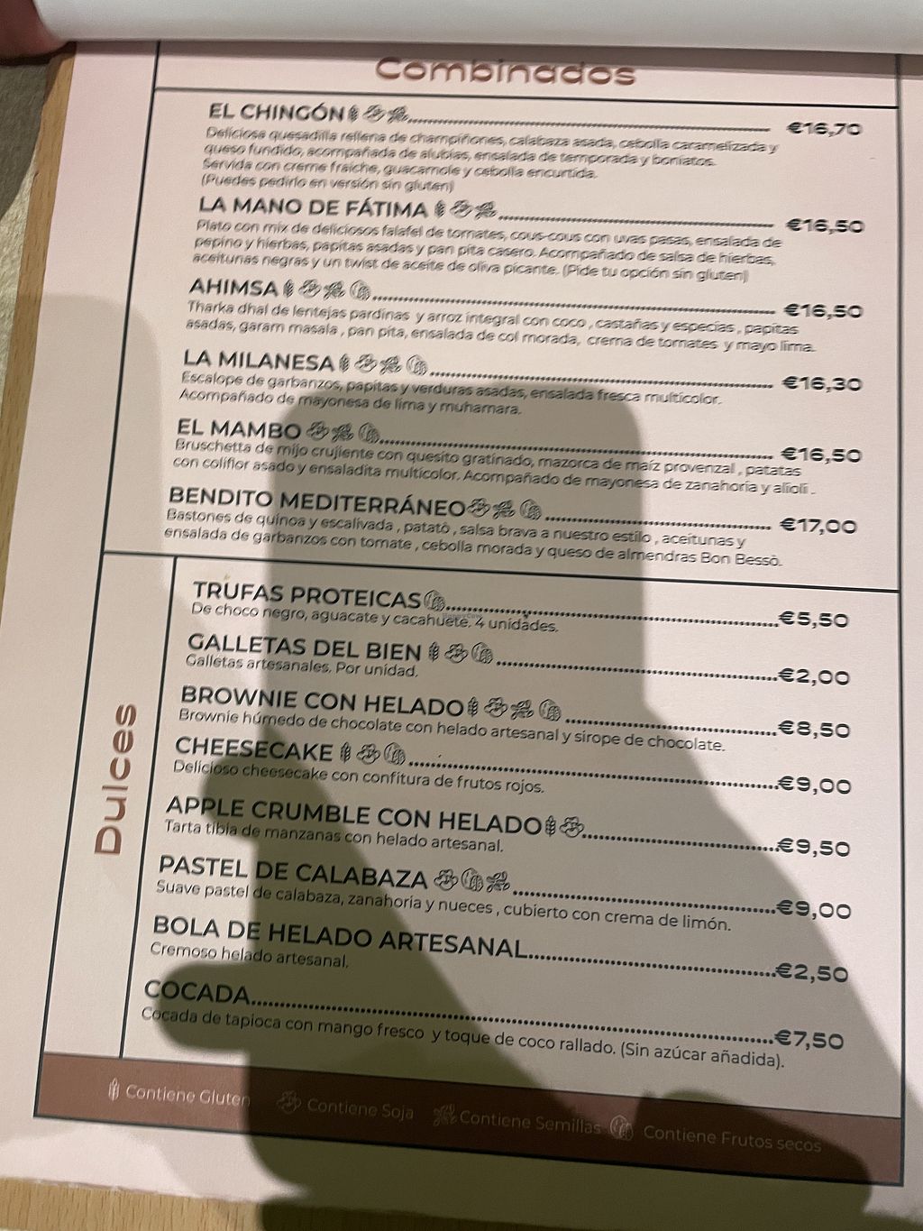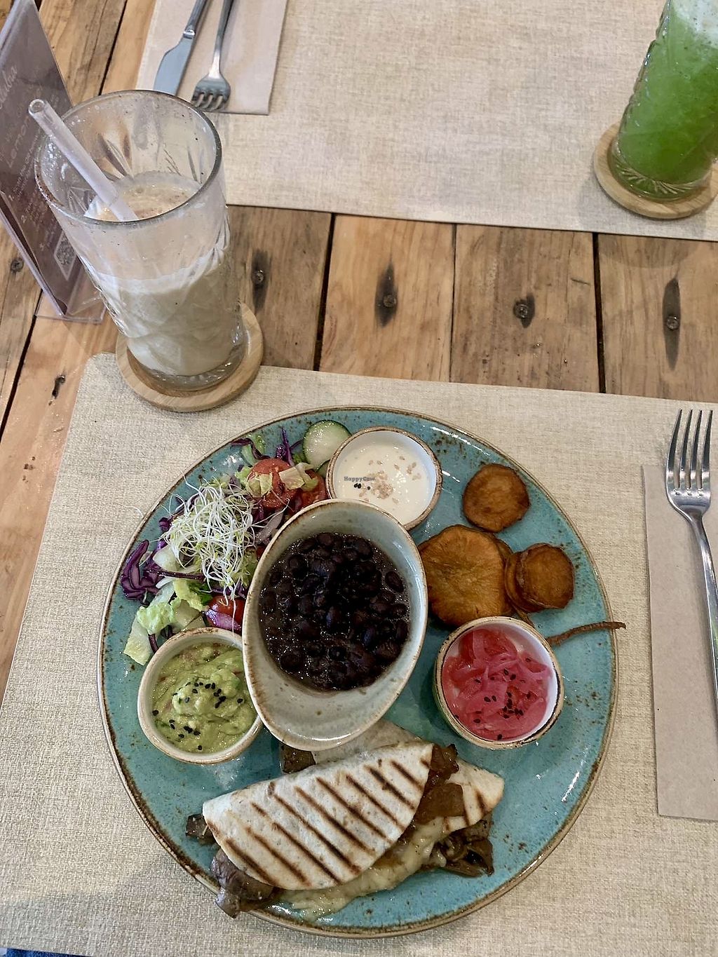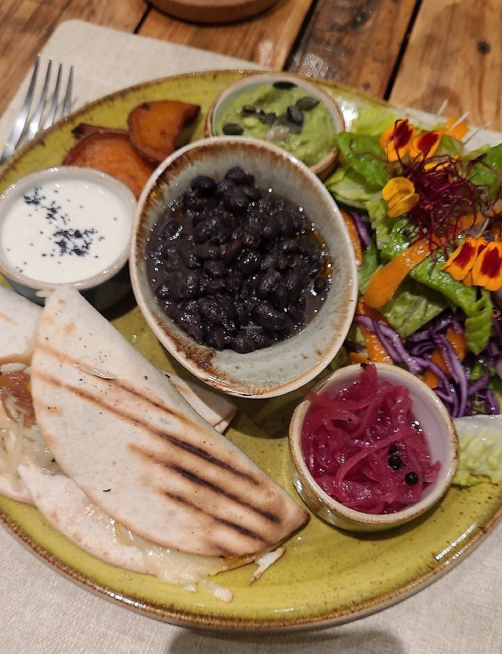 Un amplio menú, todo es vegano, hasta los postres, hay cheese cake vegano🥹🥰, nosotros comimos un medalovers que hasta encantó a un meat lover y yo comí "El chingón" unas quesadillas con queso vegano, alubias, guacamole una ensalada y batata con salsita. Las porciones eran bastante grandes.