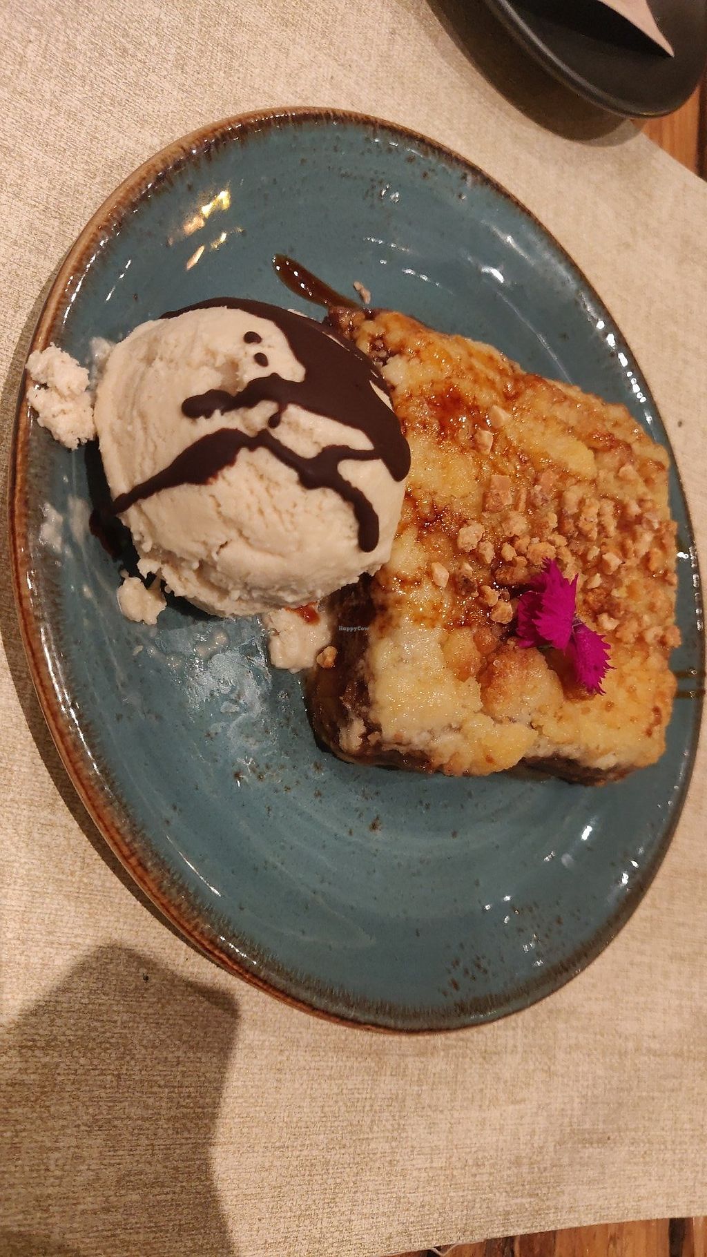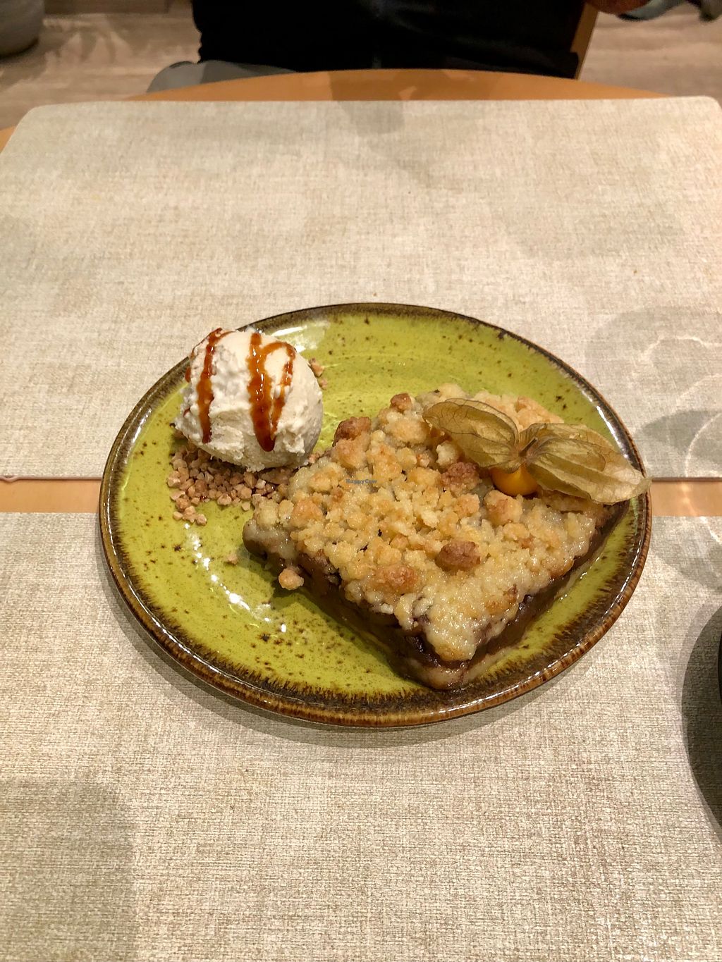 I chose the chickpea fritter with roasted potatoes / vegetables and salad. It was accompanied by 2 dips and even a cute flower on the dip. A lot of effort had been put in to make the dish attractive and tasty. Very healthy and filling. I also made room for the apple pie which had a crumble topping and came with coconut ice cream. Delicious!
