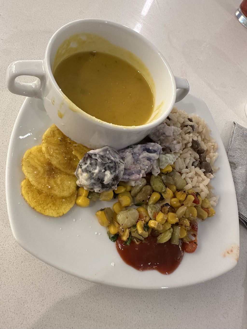 I fly a lot and have been in airline lounges around the globe. I was overly impressed with this American lounge, as there were loads of clearly labeled vegan options. I particularly loved the vegan sweet corn pudding, which I never have had in my life. There were even vegan candy bars by Unreal offered in the lounge. If this lounge is not included as part of your ticket/status, you may want consider paying for it if you want the lounge experience and be guaranteed decent vegan options. See photo of the breakfast menu for an idea of what’s typically offered.