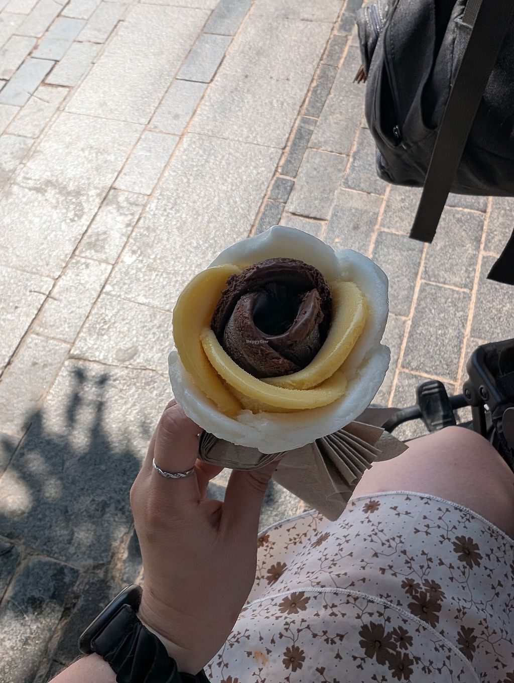 Of the many vegan sorbets, I chose blood orange and organic chocolate. The employee sculpted a flower atop the vegan regular cone. Both flavors were delicious.