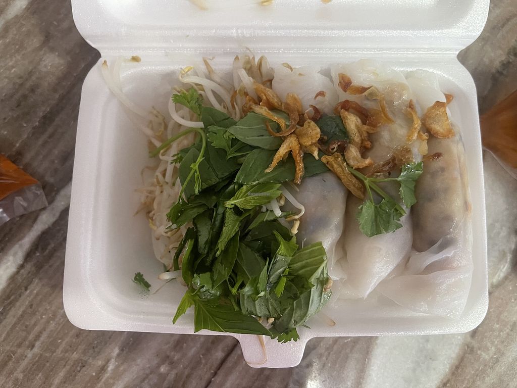 A fully vegan restaurant serving only one dish: banh cuộn chay. No English spoken and no menu in English. Limited seating inside. The owner will cook it fresh in front of customer. Located in a hem (alleyway) and about 2 meters from a busy road but the hem is very quiet. Payment by cash or bank transfer. Open Mon-Sun 5:30am-11:30am.