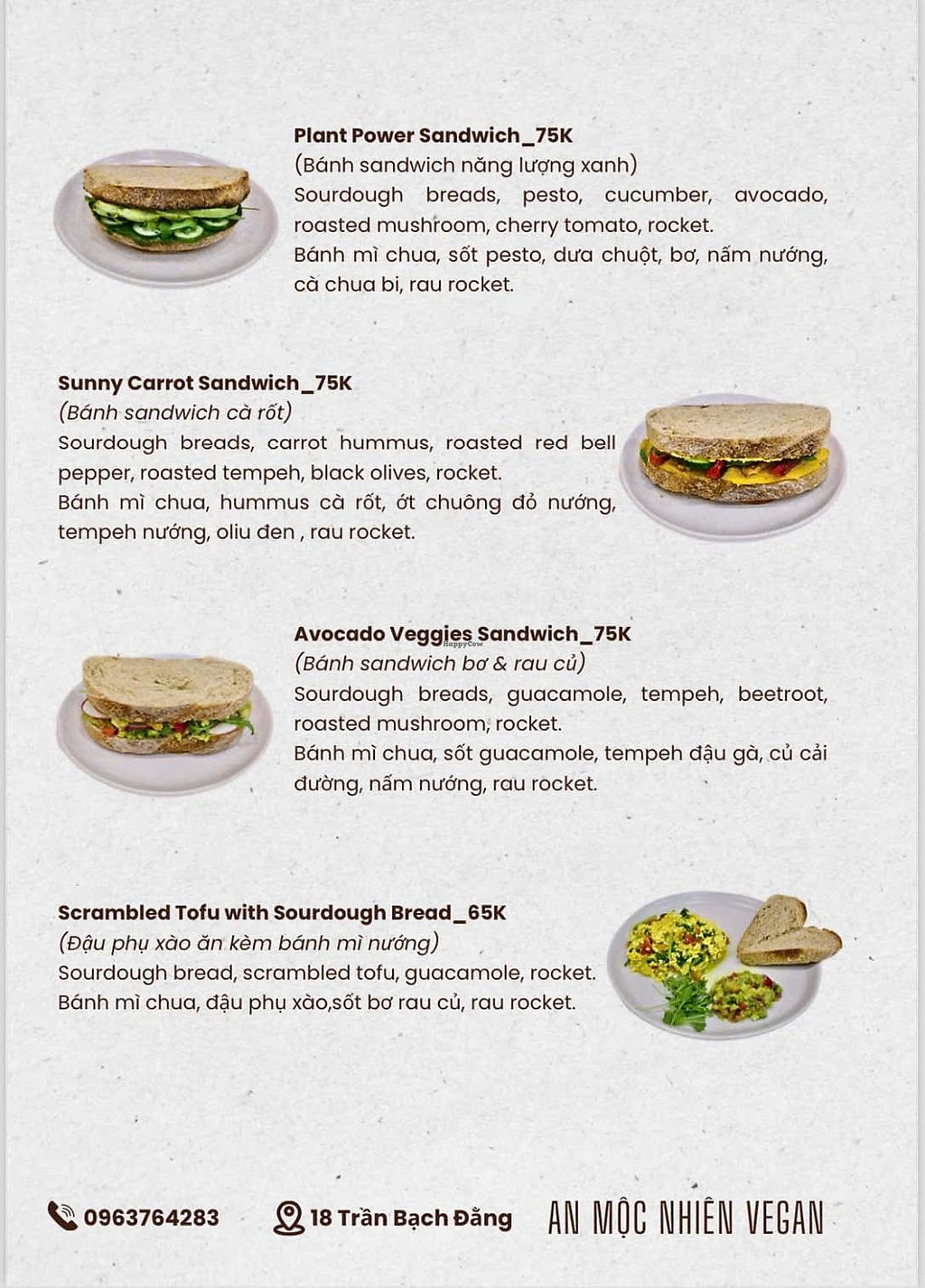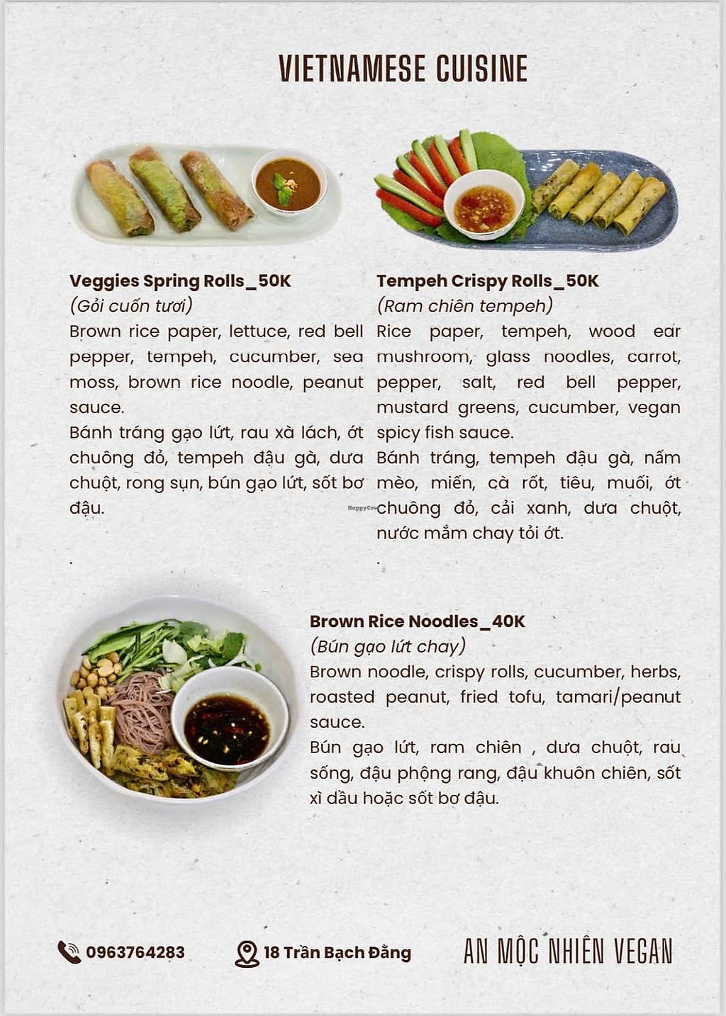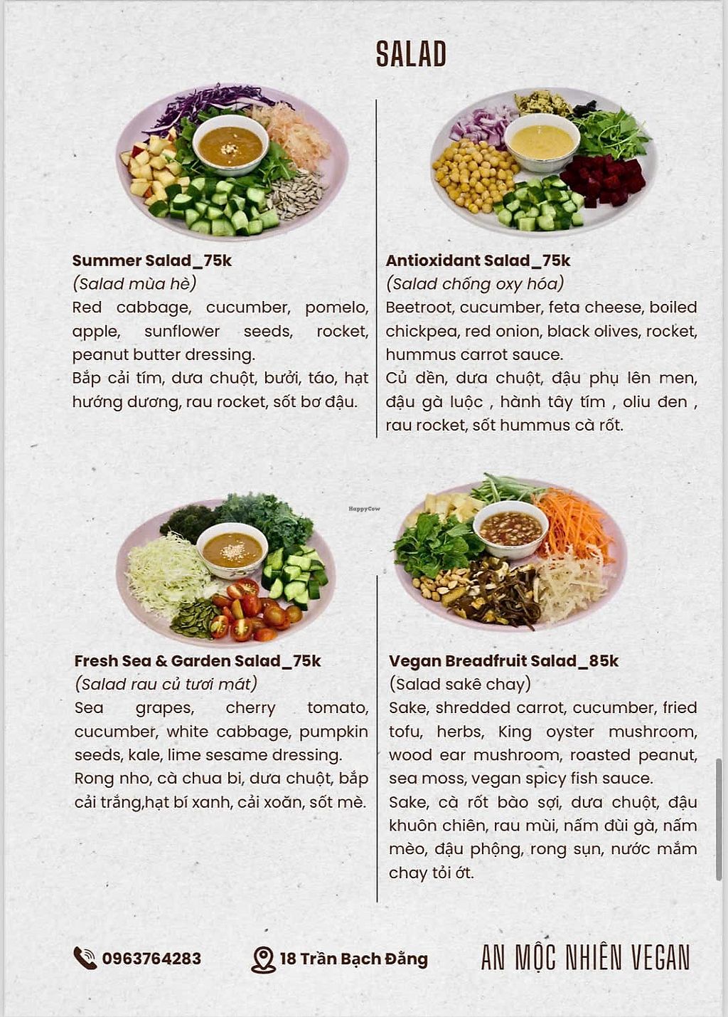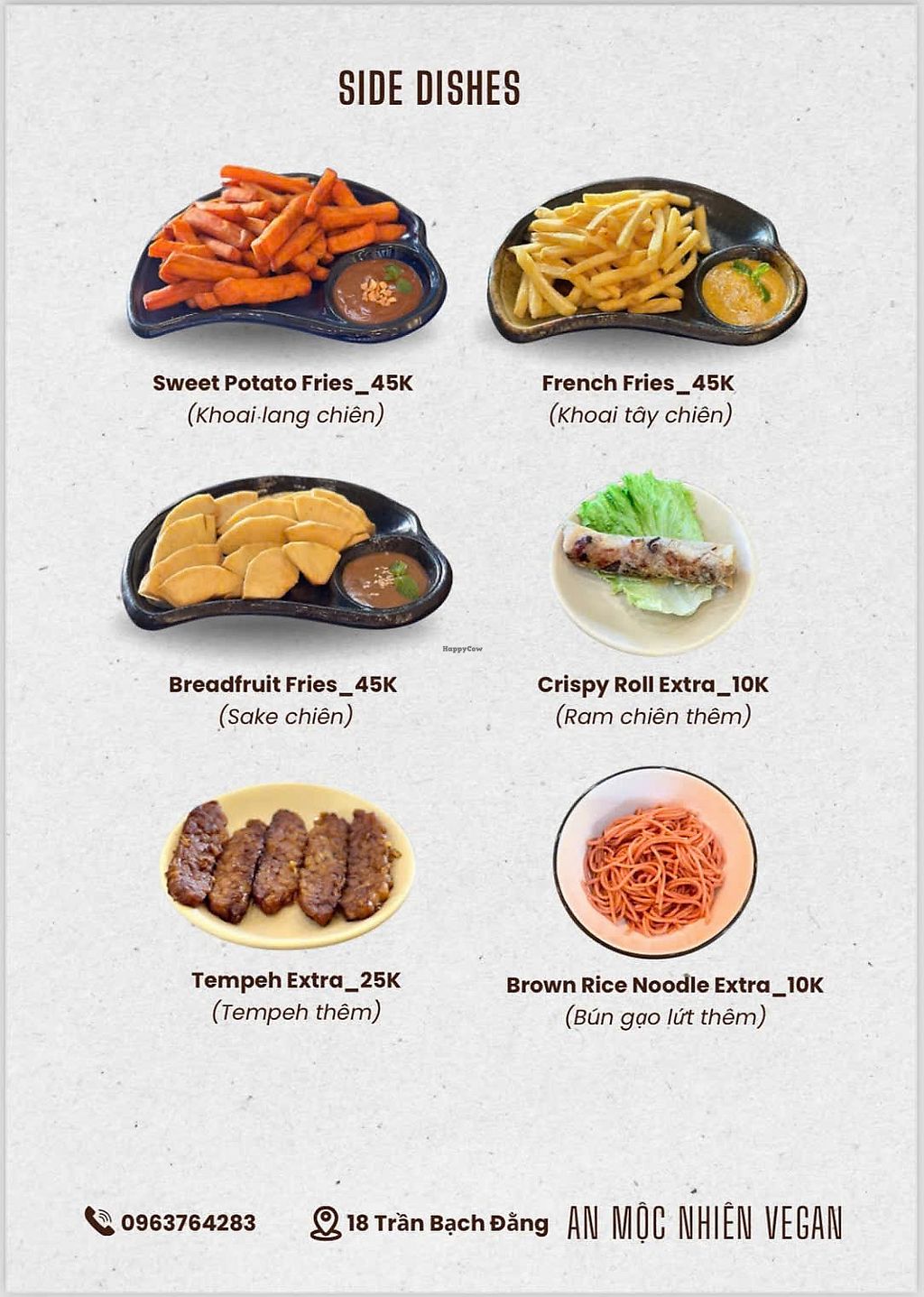 Vegetarian restaurant serving a mix of western and Vietnamese dishes. Vegan choices include breadfruit salad, crispy tempeh rolls with vegan fish sauce, vegetable spring rolls with peanut sauce, brown rice noodles with fried tofu, toasts, desserts and more. Ask staff about vegan options. Open Mon-Sun 7:00am-10:00pm.