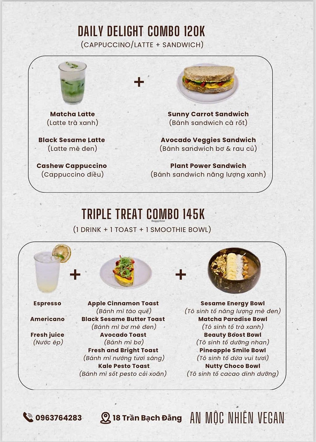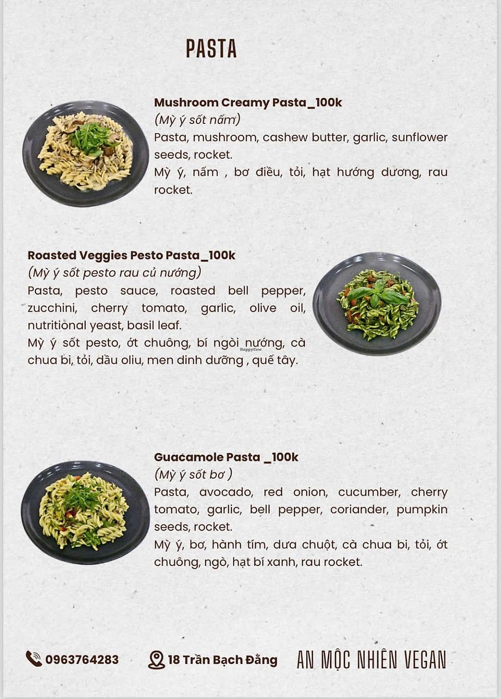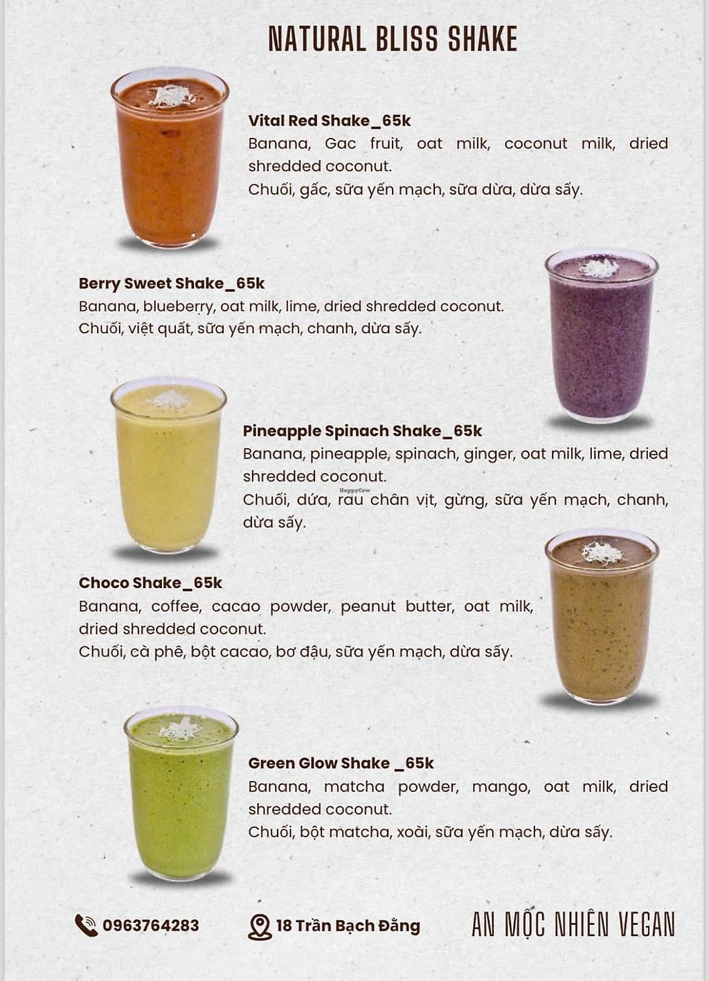 Vegetarian restaurant serving a mix of western and Vietnamese dishes. Vegan choices include breadfruit salad, crispy tempeh rolls with vegan fish sauce, vegetable spring rolls with peanut sauce, brown rice noodles with fried tofu, toasts, desserts and more. Ask staff about vegan options. Open Mon-Sun 7:00am-10:00pm.