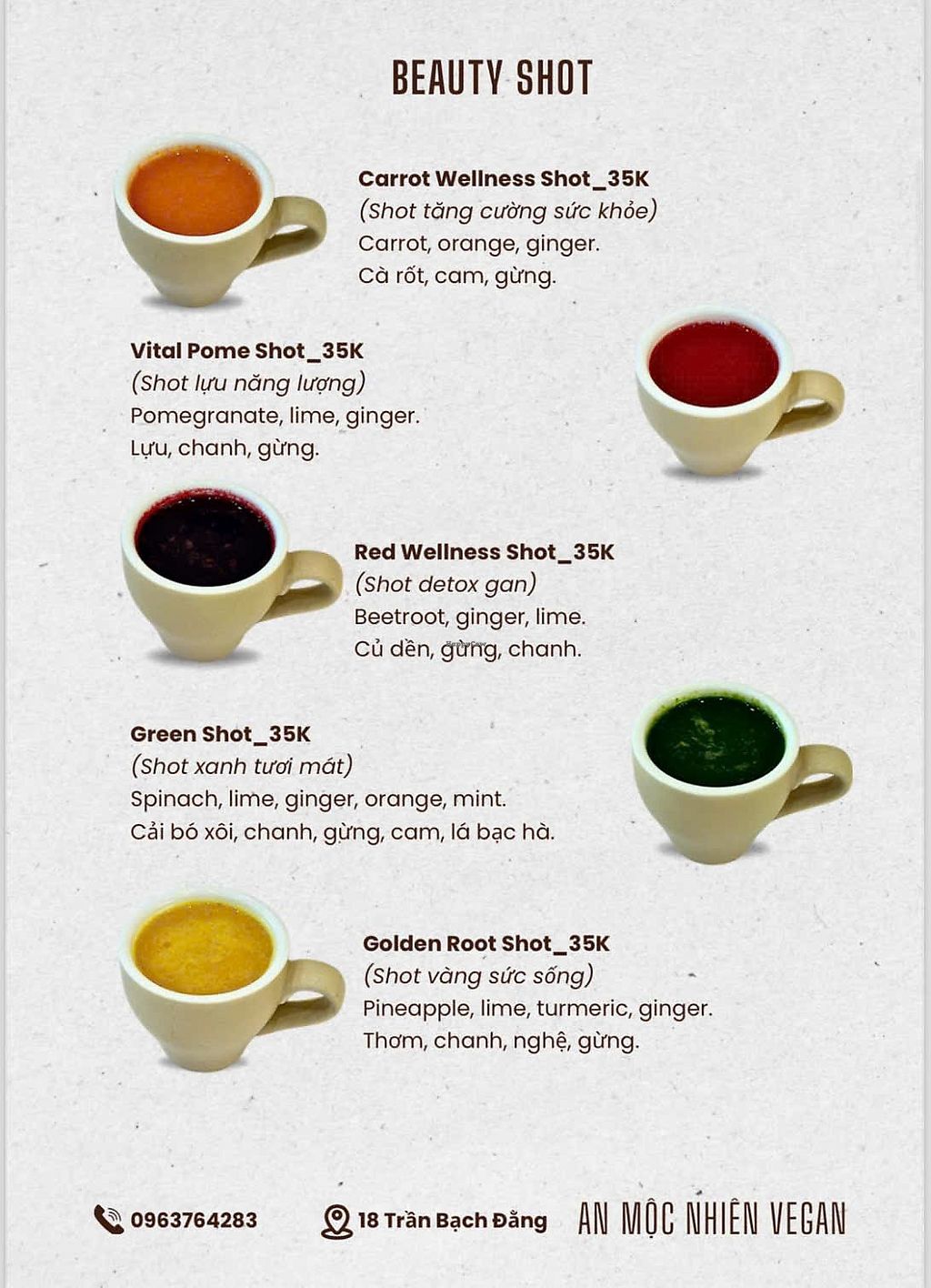 I'd recommend the Veggies Spring Rolls with peanut sauce, the carrot wellness shot, vital pome shot, and the happy "chicken" rice meal.