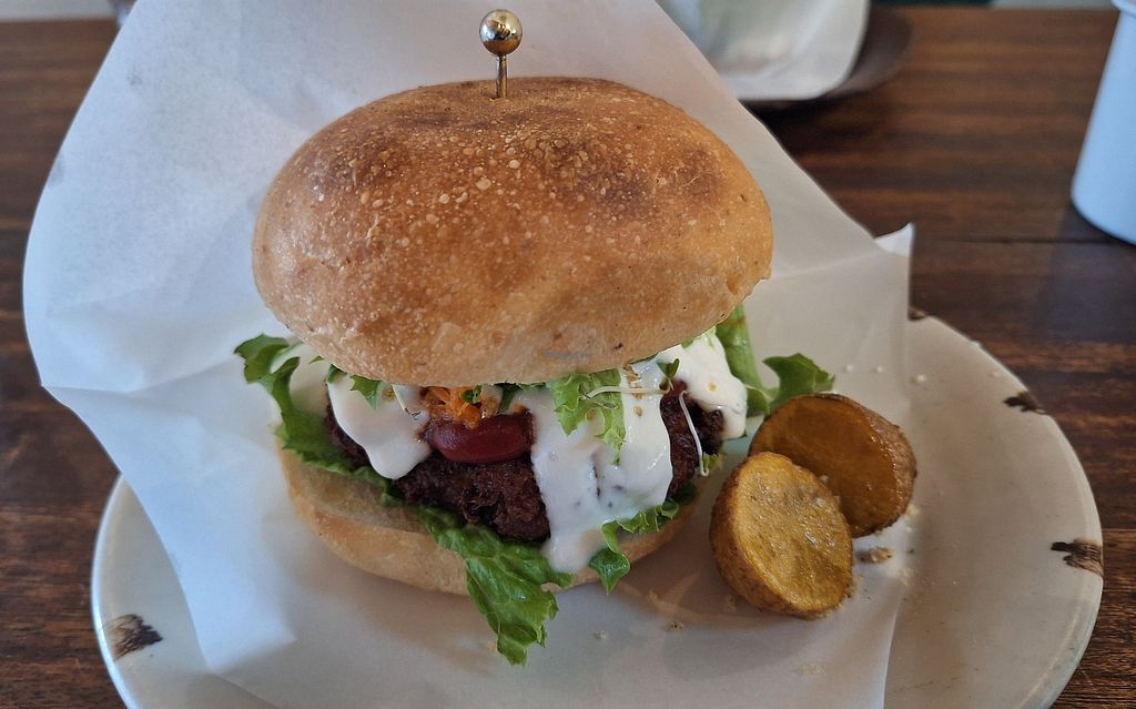 I love this place, it's very relaxing. They had chickpea patty burgers for lunch which were really nice and there's so much variety in the pastries (sweet but also some savory we couldn't try). I wish I could go there every day and try them all!