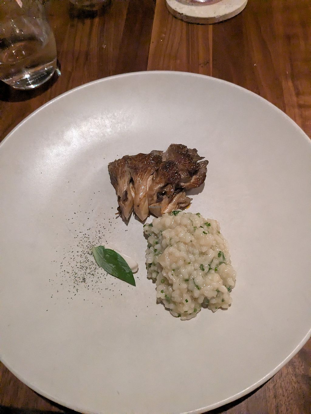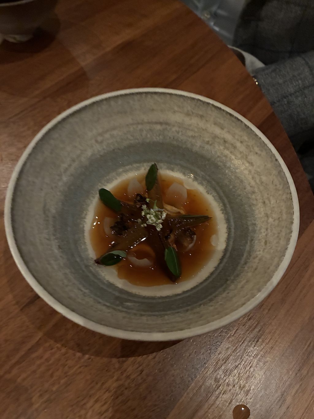 I got the short menu, but wish I would have gotten the full tasting menu as I was still hungry after. I mentioned when I made reservations that I would not have dessert. I thought they would offer to substitute something savory but they did not. So I paid for dessert but didn’t get a final course. 😐 The dishes were good but I’ve had similar dishes in other restaurants in Berlin (like Oukan). I think their chawanmushi is actually better than Oukan because they add some chestnut and Brussels sprouts at the bottom for texture. (I struggle not to gag on soft pudding like textures.) my favorite dish was the Blue Oyster Mushroom but I also want to mention the onion tea and spread as being really unique. I’m glad this place exists. They’re very creative and I appreciate their zero waste policy. I’d love to see what they come up with I future seasons.