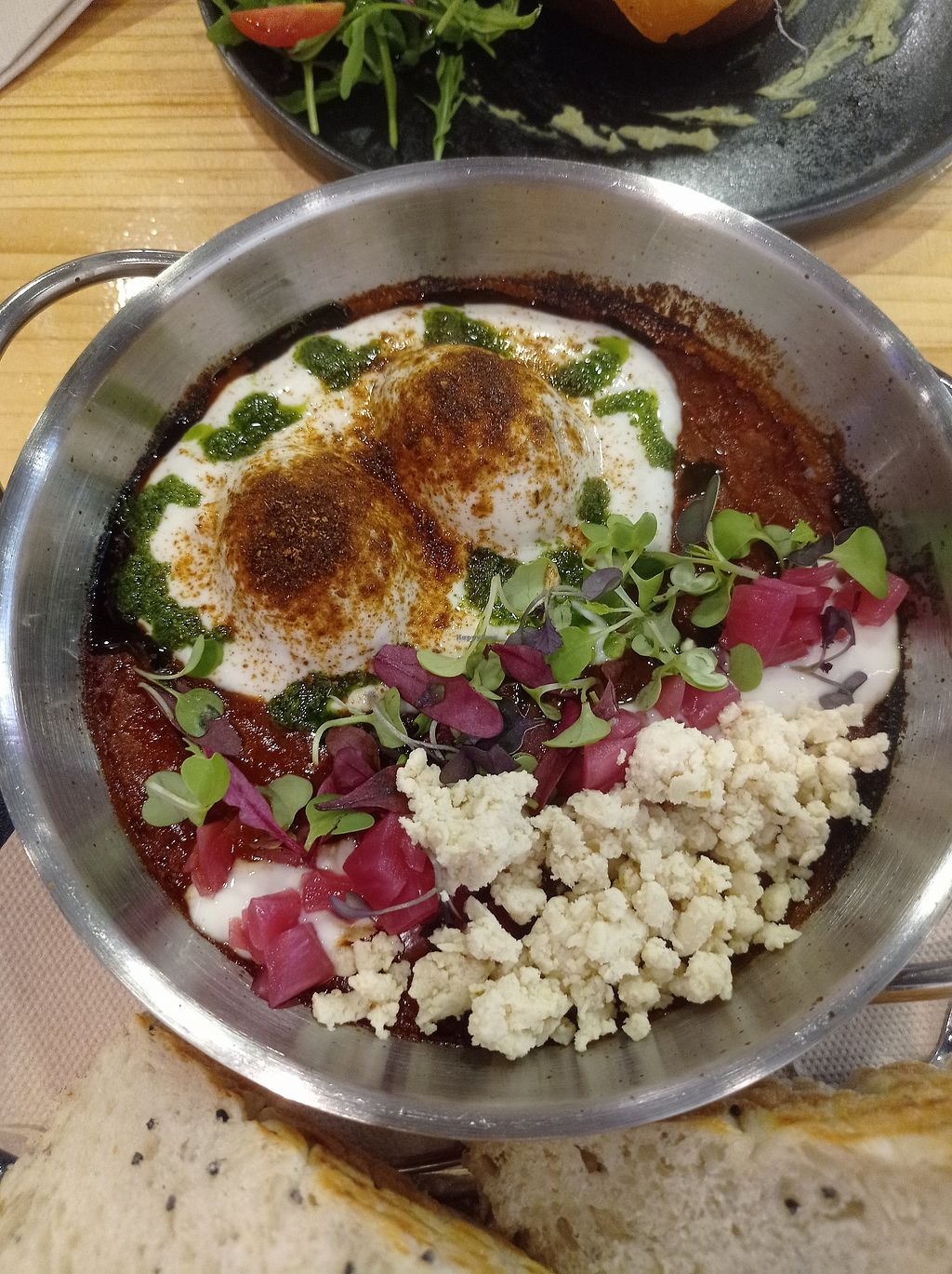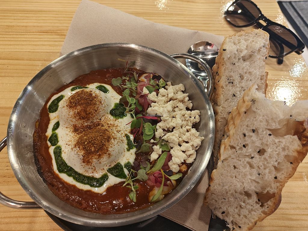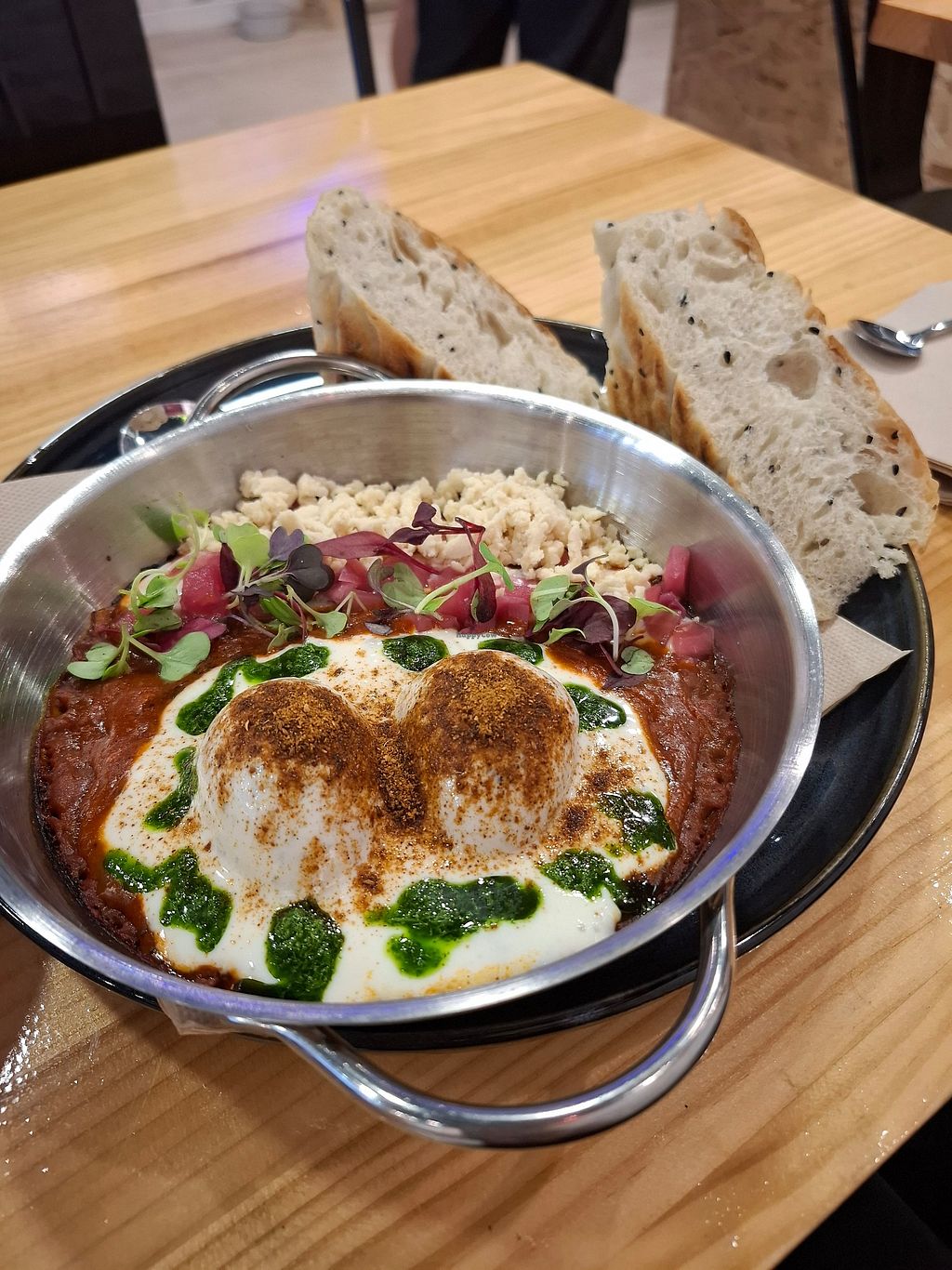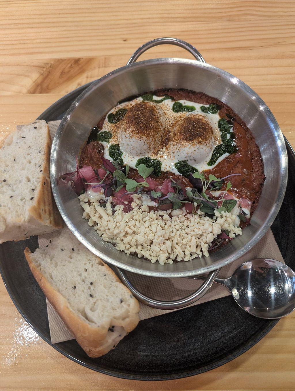 The eggs were so interesting, even with a pop and 'yolk', the flavours in the shakshuka were great & the focaccia was great to mop up the sauce.