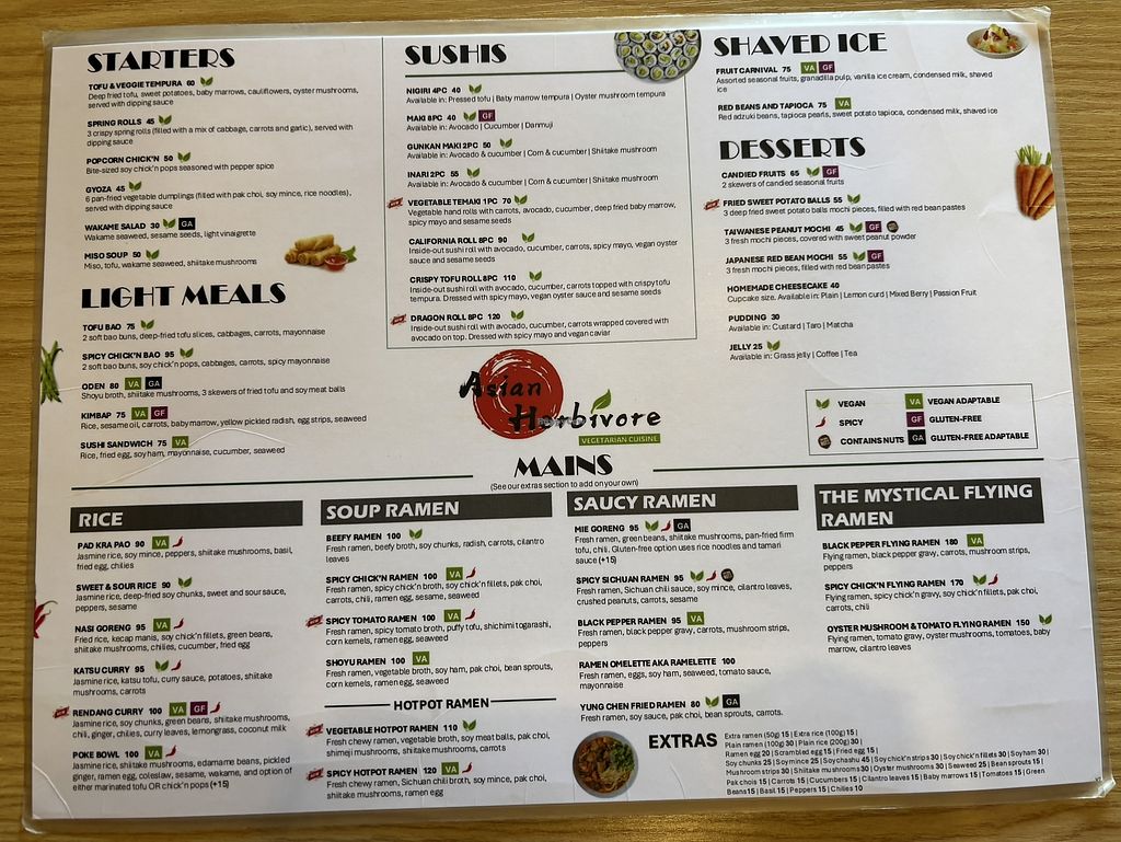 Vegetarian Asian food such as pad krao, inari, and other Asian dishes. Has many clearly labeled vegan options. Open Mon-Sun 11:00am-9:00pm. Actually opens at 11:15 am.