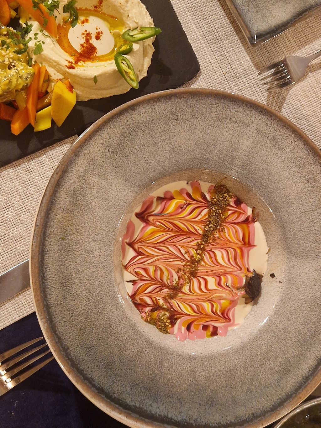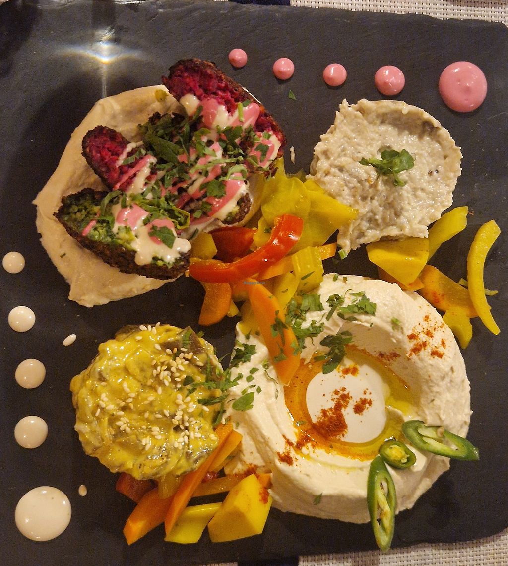 Ok so the food tasted ok, we had a couple of plates and thought they were decent. Reason marked down, ordered some dips, about £10 and just some hummus and babaganoush albeit tasty, just its romania, this is a mental price, and bread not included so extra cost (how can bread not be inlcuded in a dish if dips) sat outside in direct sunlight and not offered inside, main plate was fine but average really, water expensive, just overall a bit of a rip off so wouldnt return