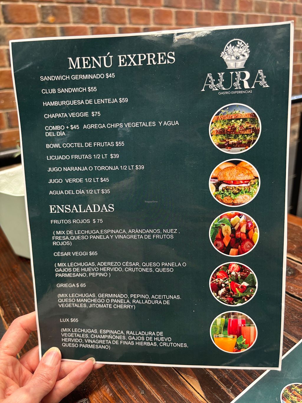Aura Gastro Experiencias is a small bar inside of Panaderia Sukram, so don't confuse the two -- Aura has a veggie menu, and the Panaderia (bakery) does not. The friendly staff at Aura made me a delicious lentil burger. It's enormous and only costs $59 pesos; that's just under $3 USD. For another $45 pesos, they add the fresh agua del dia (this day it was watermelon) and chips. I did not need another meal for the rest of the day. You'll need to specify if you want it to be vegan; the default is that it comes with cheese.