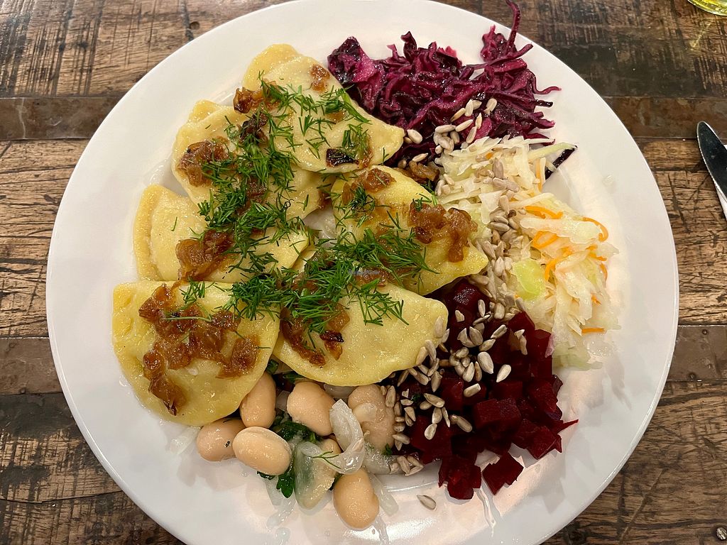 Das kleine Restaurant bietet eine Auswahl an klar gekennzeichneten veganen Speisen. Die Zubereitung ging schnell und die Varenyky sowie die Beilagen waren sehr lecker! Die Zubereitung ging sehr schnell. Sitzen kann man an den freien Tischen in der Markthalle Acht.