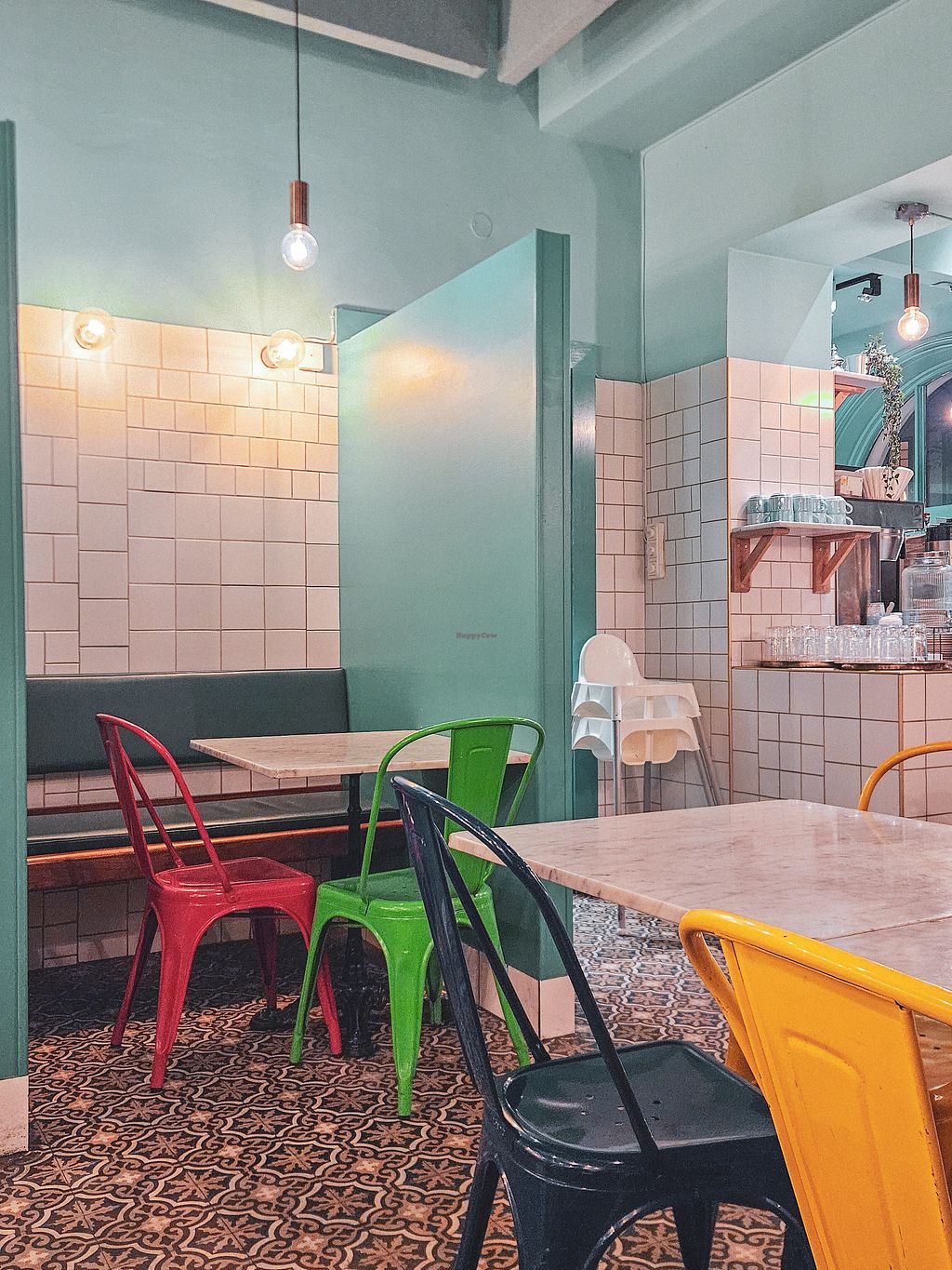 The interior is beautiful, with blue/turquoise pastel colored walls and colorful chairs.