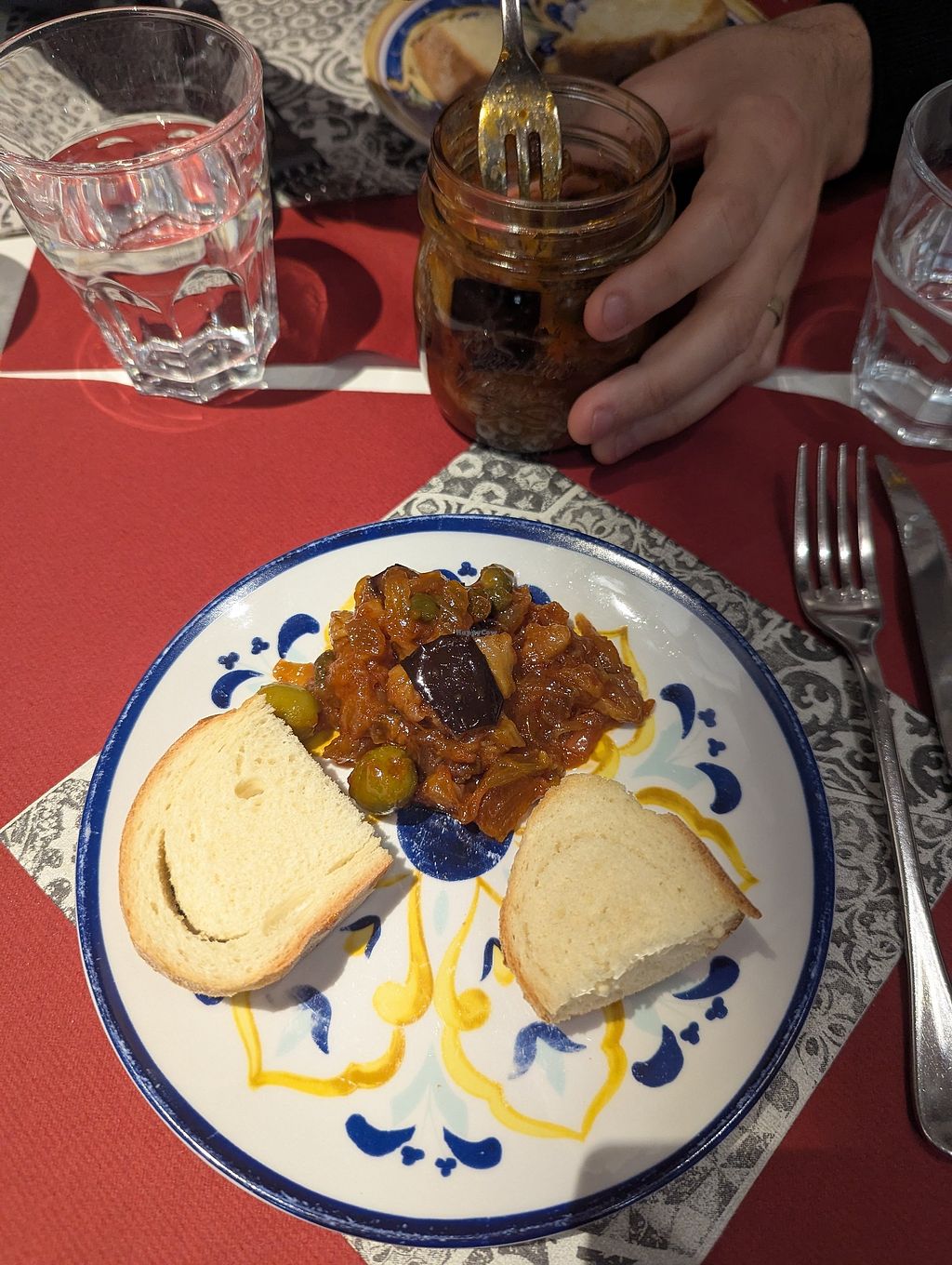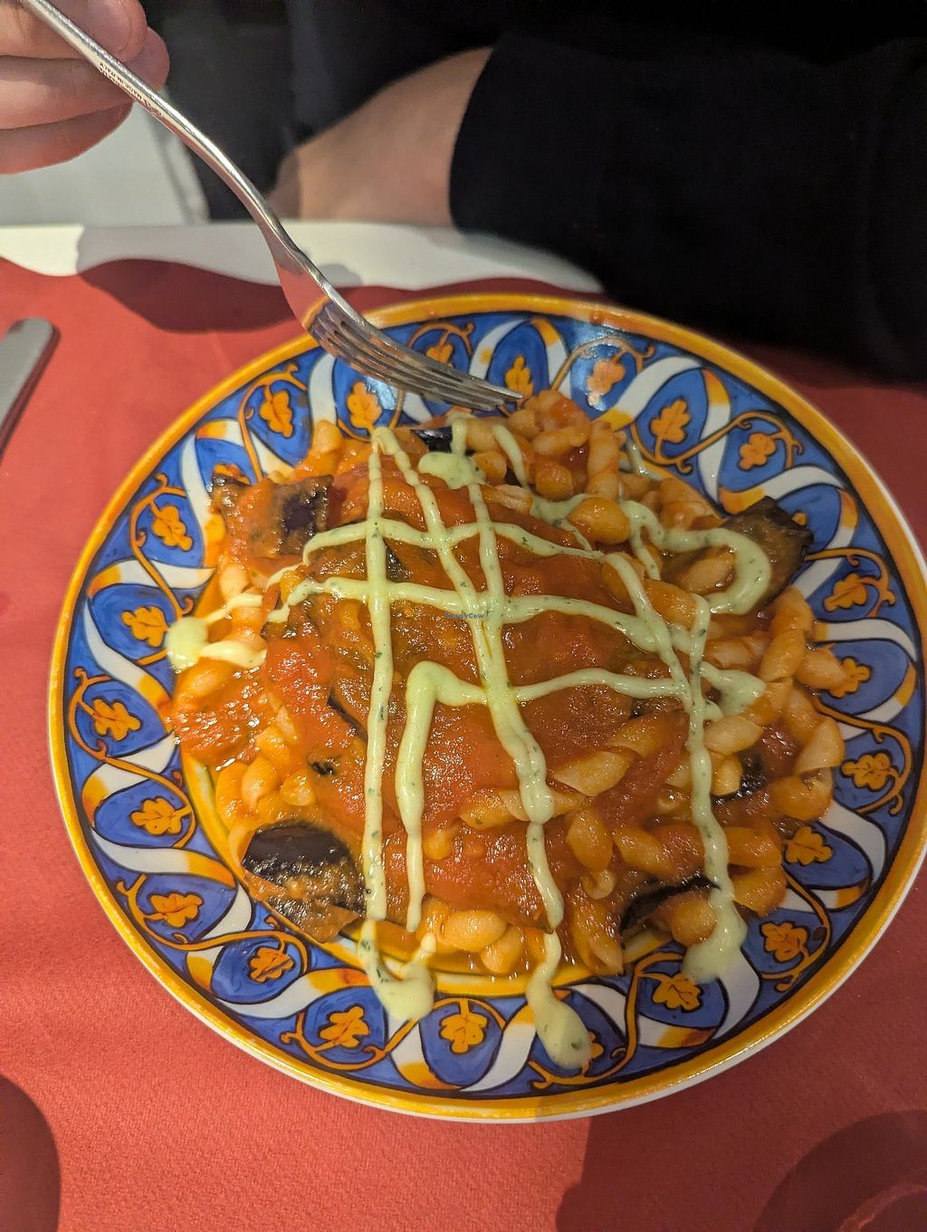I read that this was a gem for vegan options, and even though no clear vegan options were labelled on the menu, we decided to give it a go. Staff were super friendly and explained our options (a fried aubergine starter and a fried aubergine pasta main). We both went for the main. The pasta was fresh and an interesting shape. Very very intense but super tasty! I also had a typical Sicilian spritz. I personally prefer the bitter Campari but i loved the color and was definitely part of the experience!