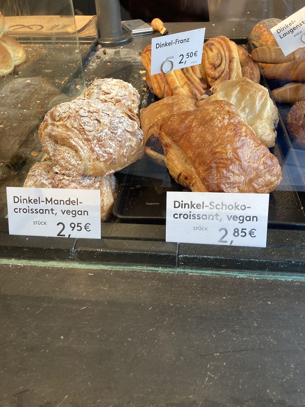 There are various sweet vegan options (I had a chocolate croissant) and good bread. However, it is quite expensive – we paid over €6 for two small bread rolls and a croissant.