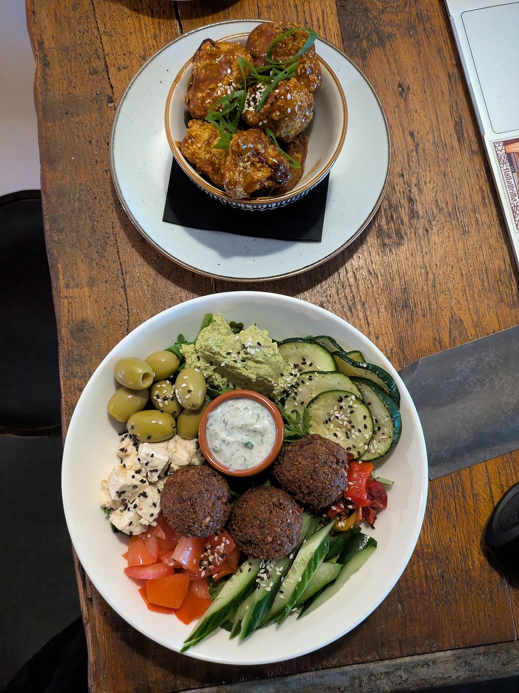 Got the cauliflower wings which were really good. Falafel bowl was pretty good. Nice matcha.