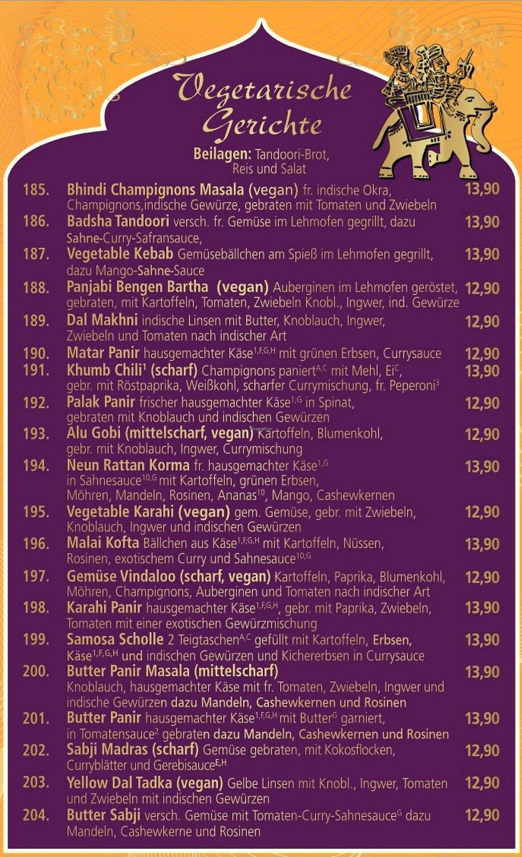 Leckere indische Speisen. Mehrere Gerichte sind vegan gekennzeichnet. Naan ist hier immer vegan.