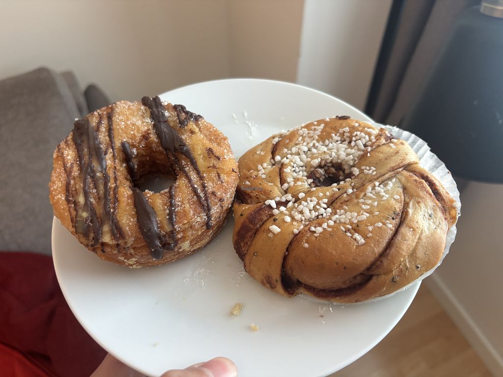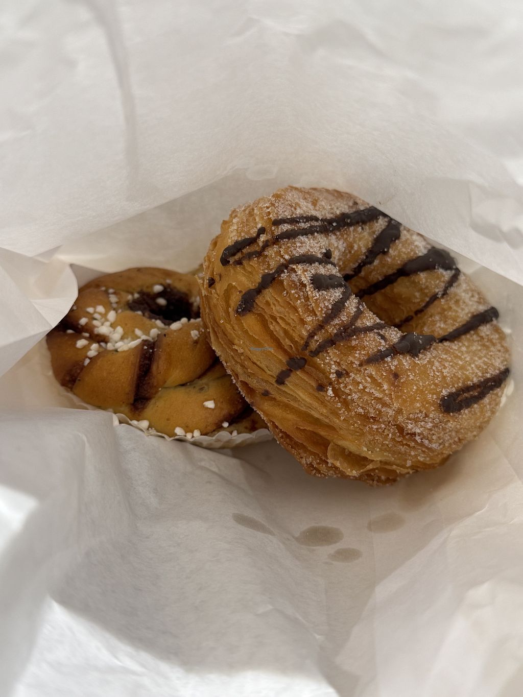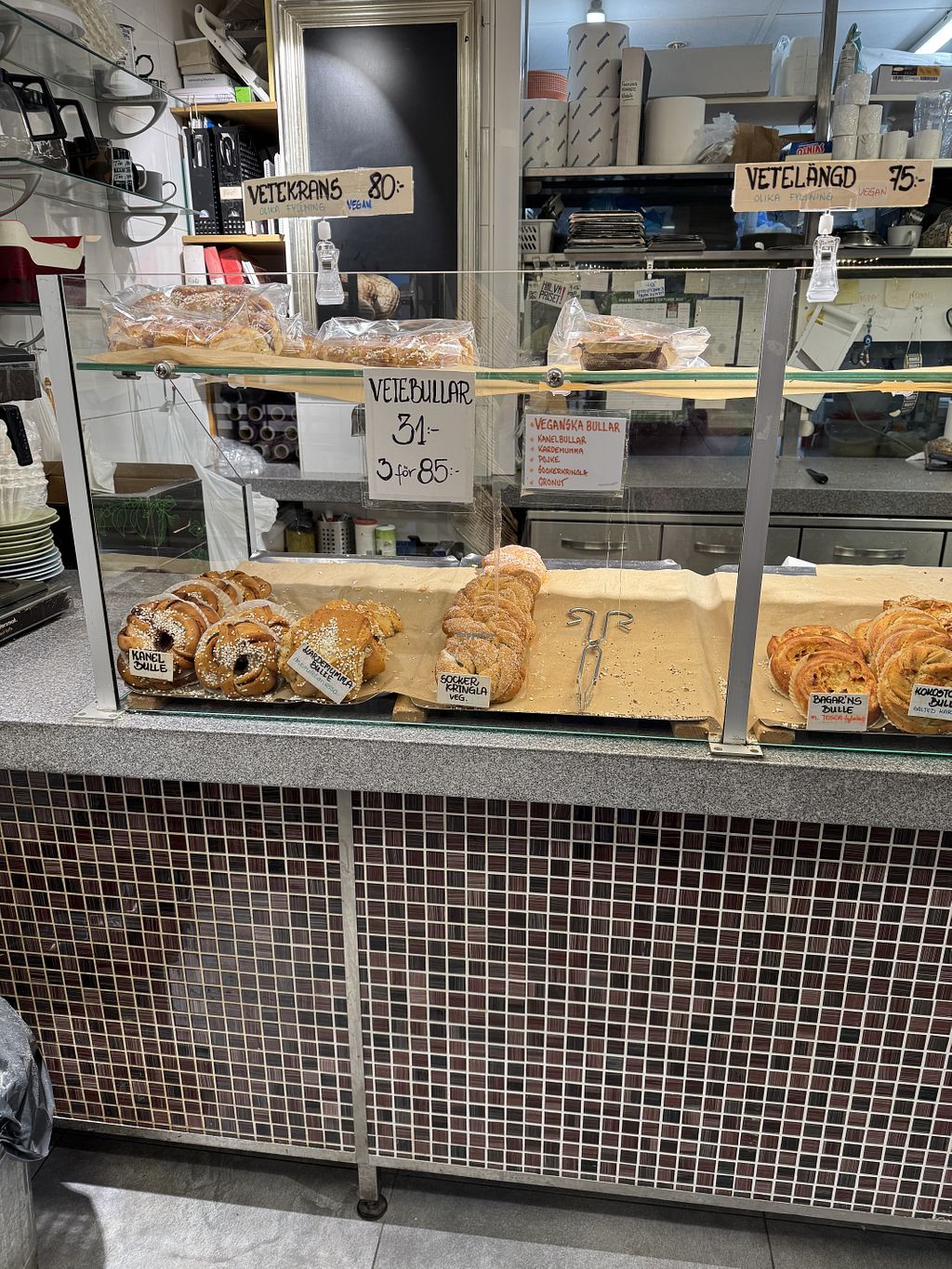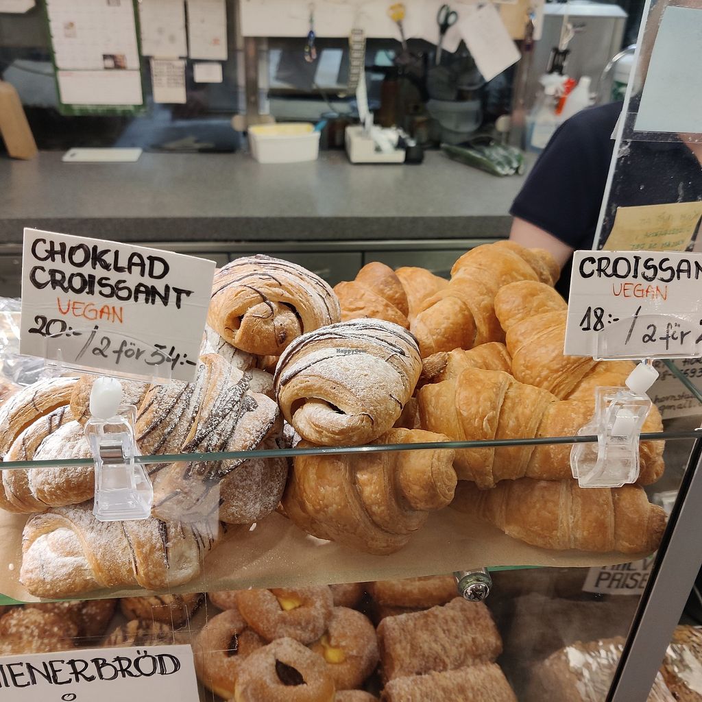 I got a slice of vegan princess cake, a chocolate croissant, a banana chocolate cronut, a kardamombullar and a kannelbullar (cinnamon roll). The chocolate croissant was amazing. The rest were unique and good.