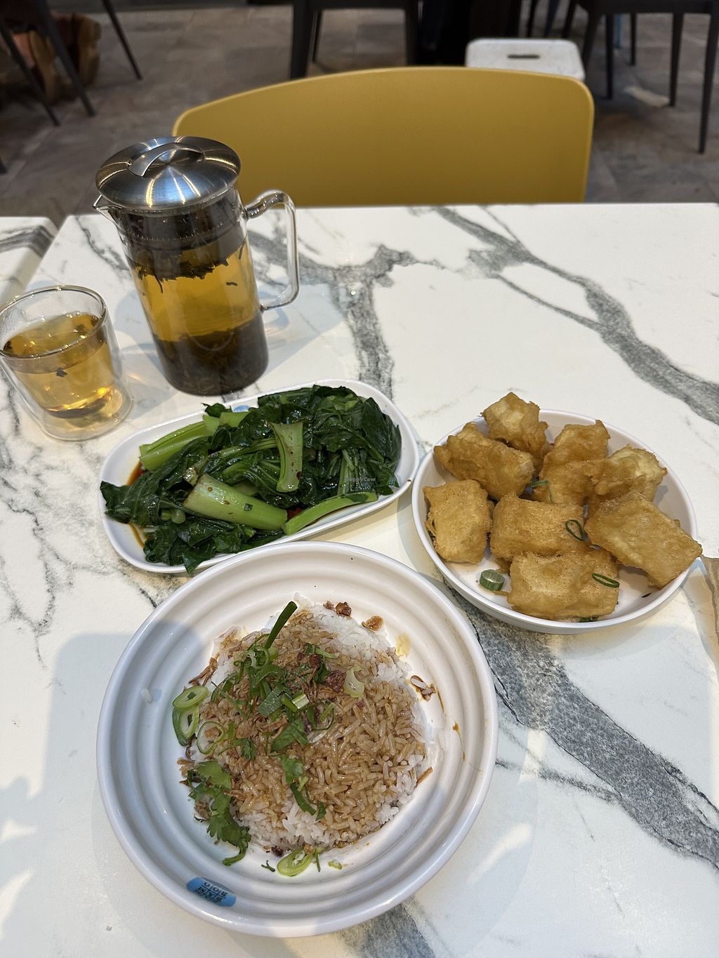 No frills place for dinner for one. Some vegan options, including dim sum. Under the vegetarian section of the menu. I went straight for the shallot rice, crispy chilli tofu and seasonal greens and jasmine tea. Quick and easy to order, just what I needed after long flight