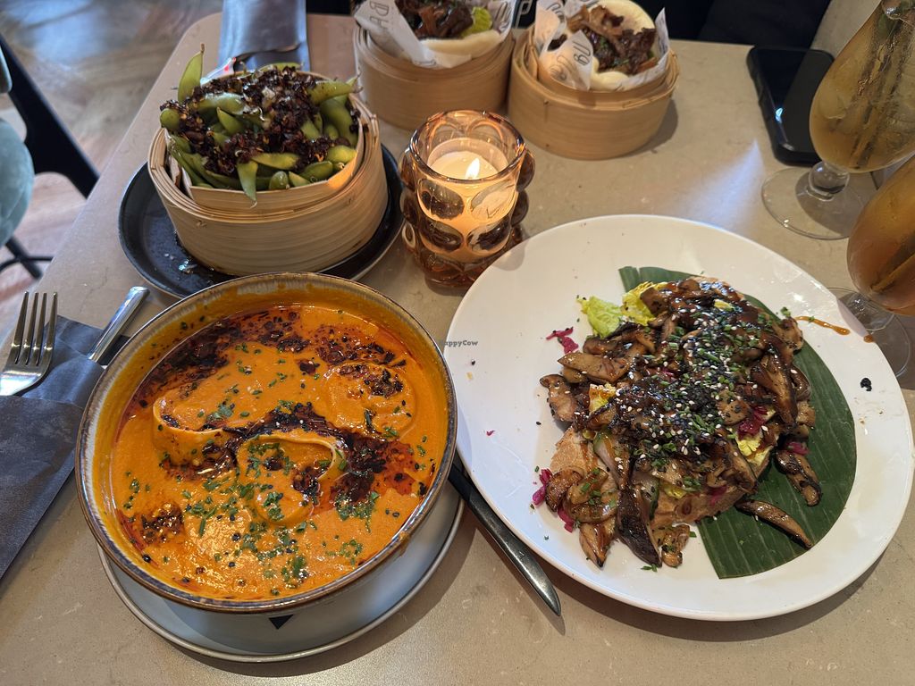 There were multiple vegan options on the menu and it was clearly labeled what was vegan or vegetarian. I recommend the vegan bao and vegan dumplings! The ambiance is very nice, cozy and classy, very beautiful inside. Service was very nice too!