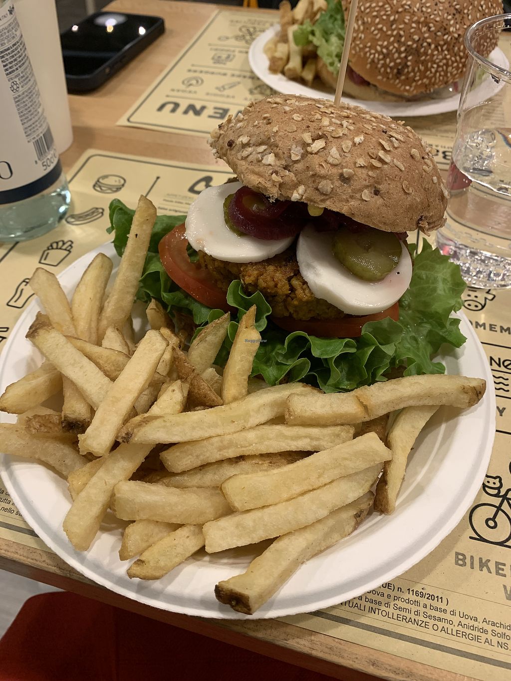 Hamburger vegano delizioso. Non si tratta di un beyond burger ma di una polpetta costituita da riso e verdure. All'interno del panino è presente mozzarella vegetale e cipolla. Possibilità di accompagnare il panino o i contorni con maionese vegetale.