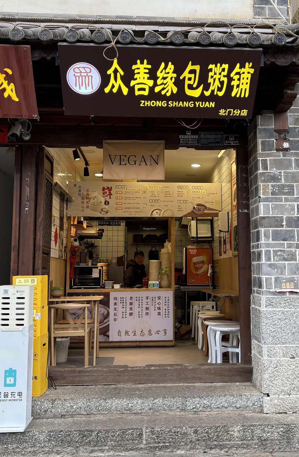 What a great find. It's a tiny shop (wholly vegan in October 2024), with very limited seating and they mainly do takeaway orders, but there is space to sit. I recommend the walnut soy milk, lichen bao, and wild mushroom bao. They also have vegetable, rose red bean, and brown sugar bao. The millet porridge is plain but very comforting. There is no English, but the owners bent over backwards to use their phone to help translate.
