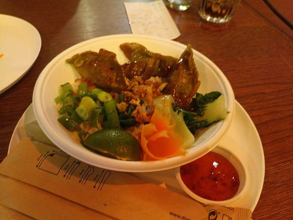 This place is the only one in Foodhallen that has clearly labelled vegan options. The staff is also helpful and have a list of allergens ready to go. The food was very tasty. Portion sizes were small, and it was a bit pricey for what it is. However, the main problem is the venue it's in. The music is so loud, you can't hold a conversation without yelling. Also, they hold a monopoly on beverages, and the prices are high are the bottles are tiny.