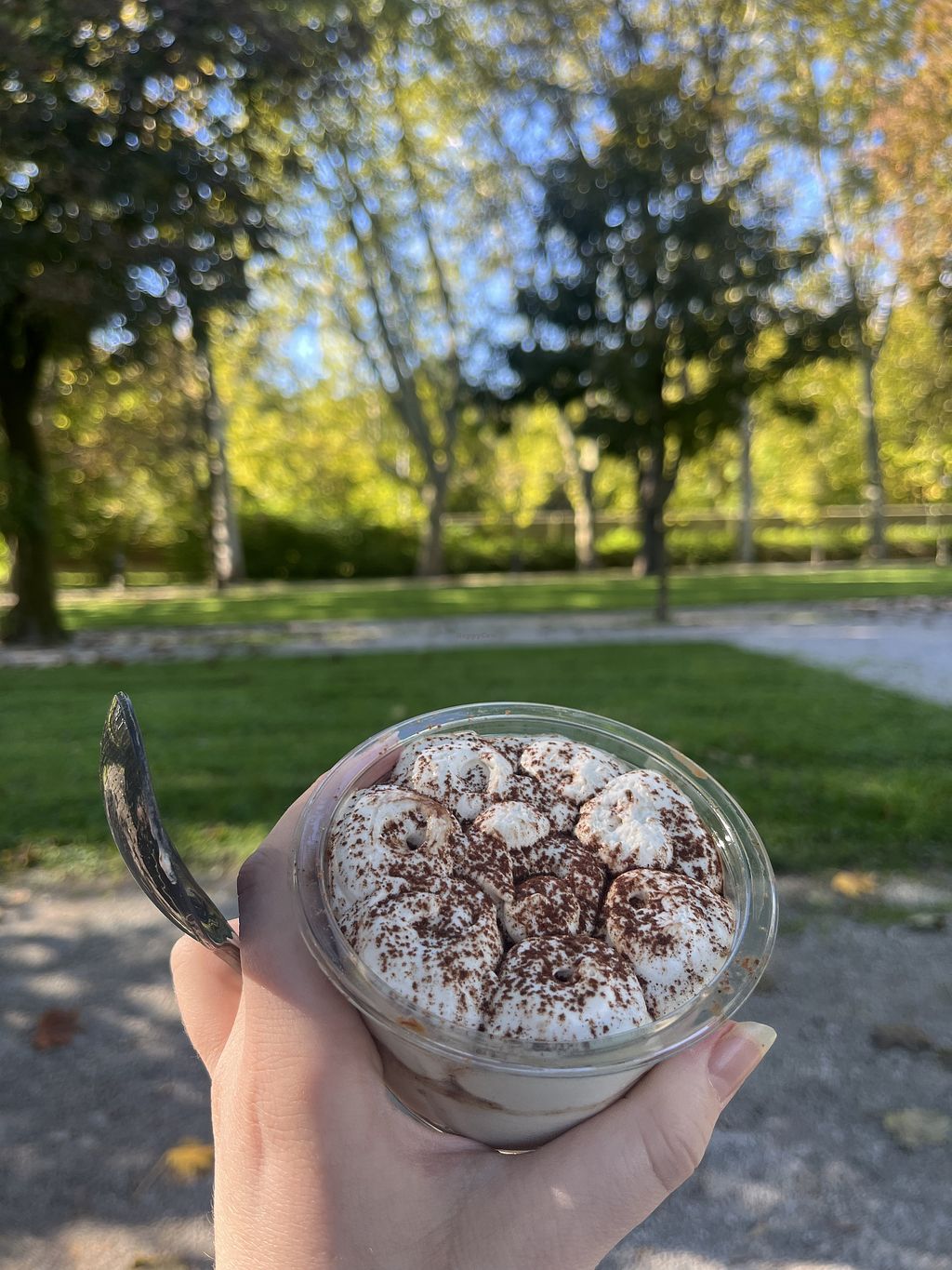 We had a nice cappuccino with oat milk and a cream cake. Very satisfying and delicious. On the more expensive side.