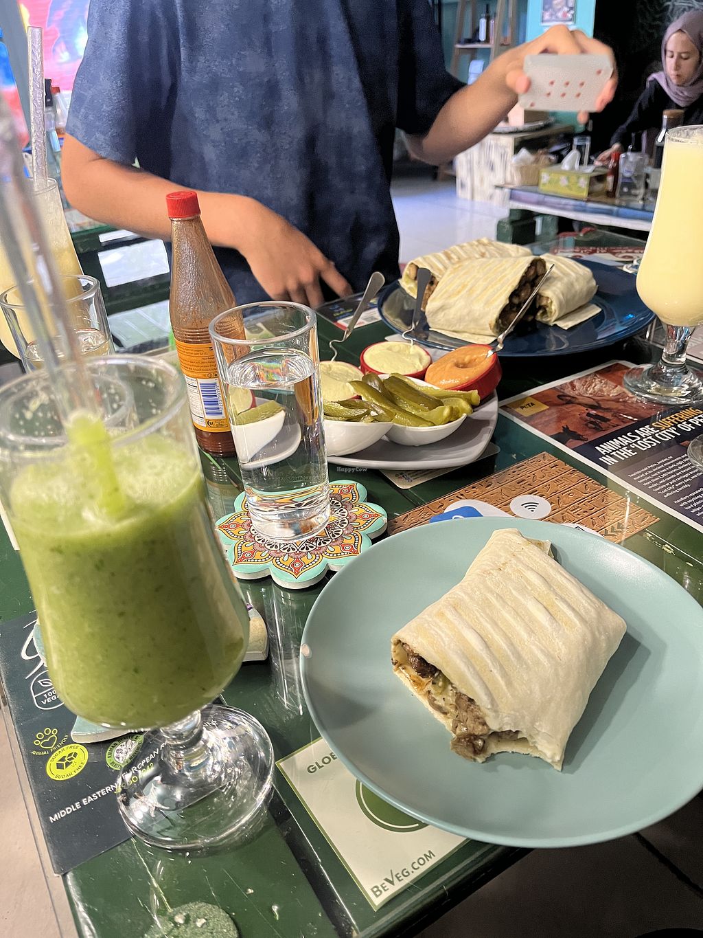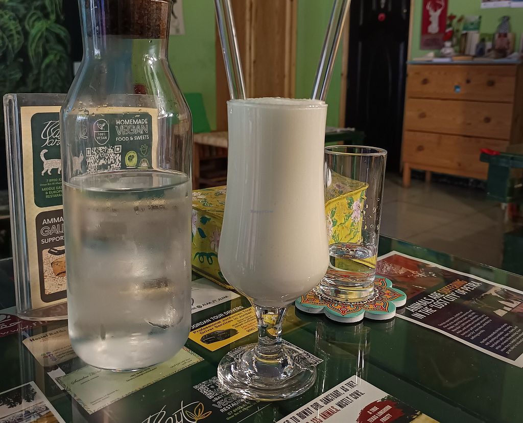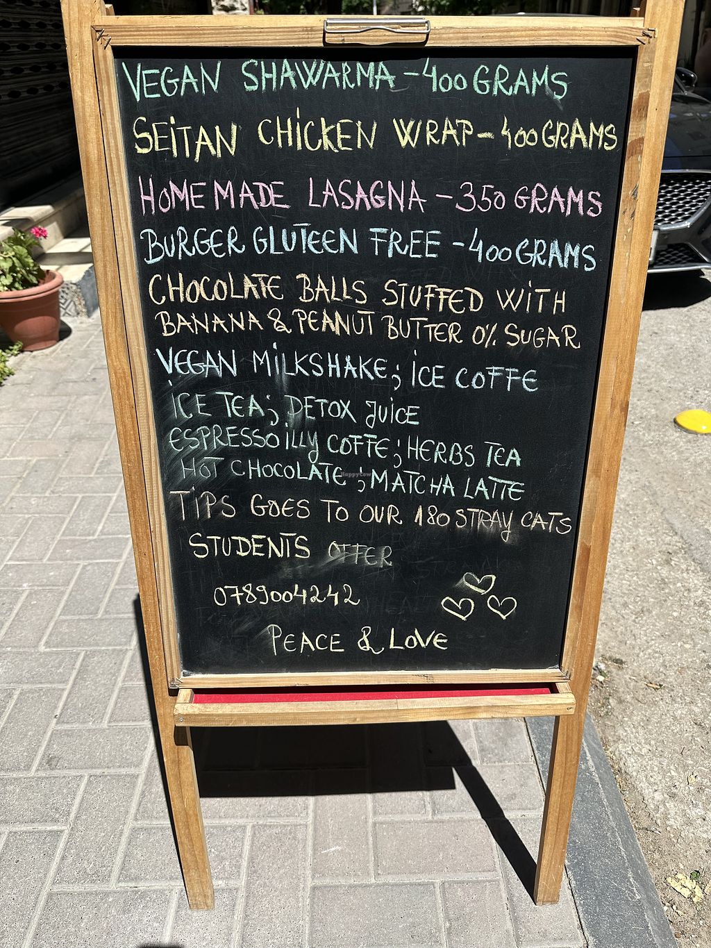 We went there twice and really enjoyed the vegan shawarma as well as the bbq wrap and the iced cappuccino was definitely very unique and delicious as well! The cats are super cuddly and sweet and Sami is a great host! We were happy to see there‘s vegan people in Amman and also how much love and effort they put in rescuing the cats and trying to make a difference! Highly recommend coming to this sweet little place when visiting Amman!