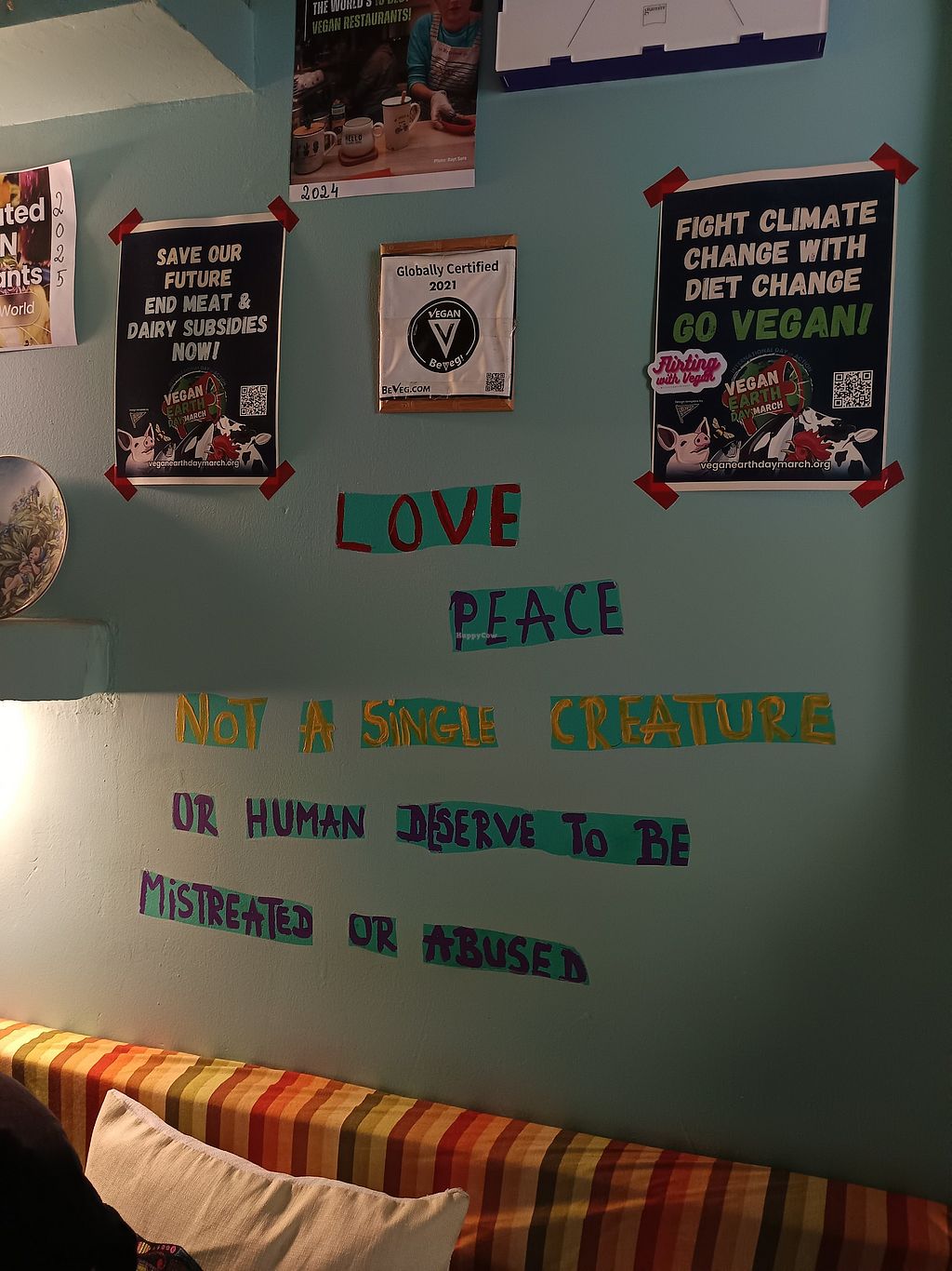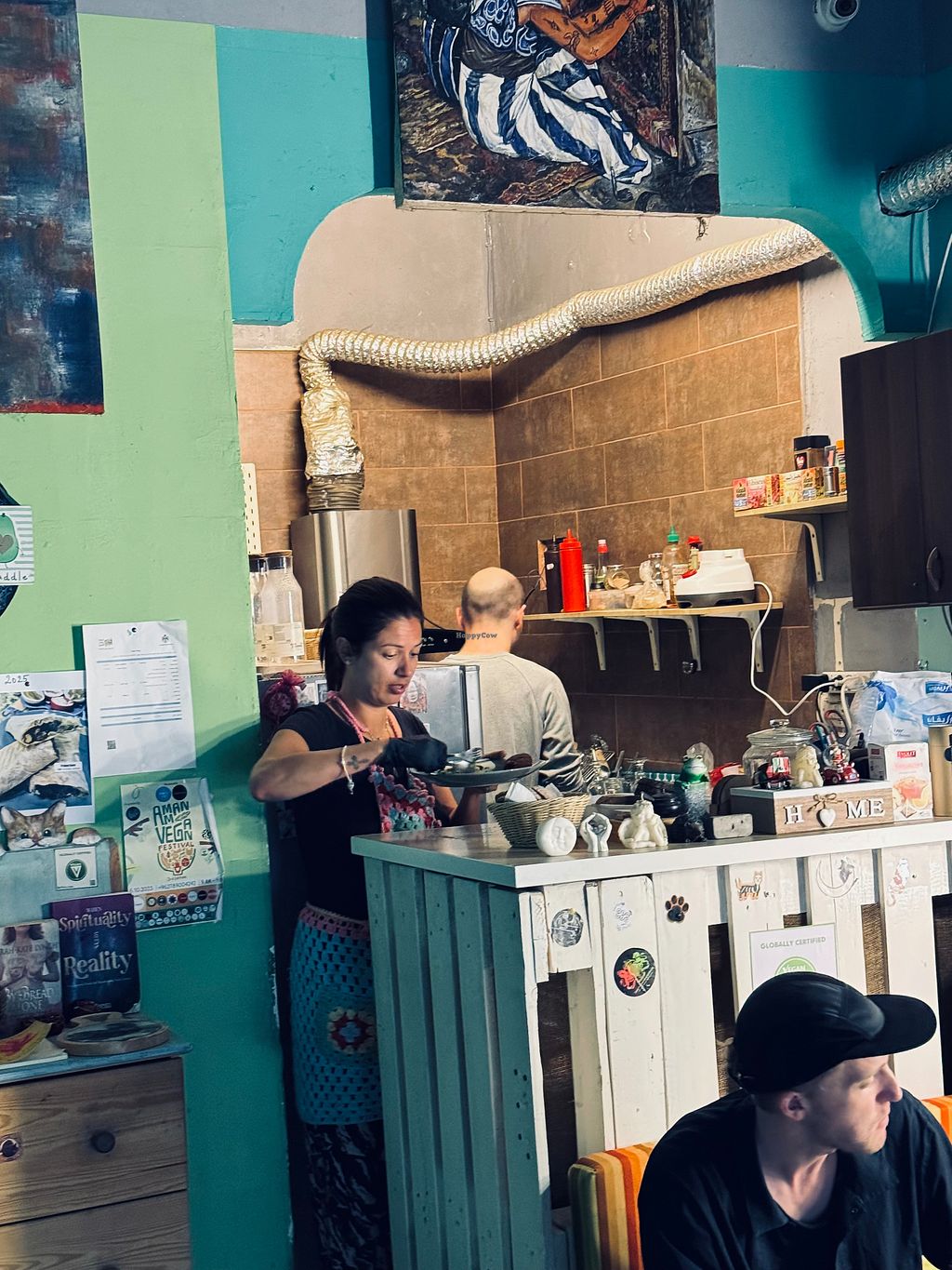 Highly recommend. Came here with my partner the other day, and everything was amazing. The food is delicious, the cats that hang out around the shop are super friendly, great music playing, the place itself is beautiful and littered with all sorts of cool stuff, art, flyers, stickers, etc. The owners are also super warm and welcoming, and I loved how passionate they are about not just their food, but their activism and staying true to vegan ideals beyond that. Definitely will be coming again, and happy we got the chance to do so.