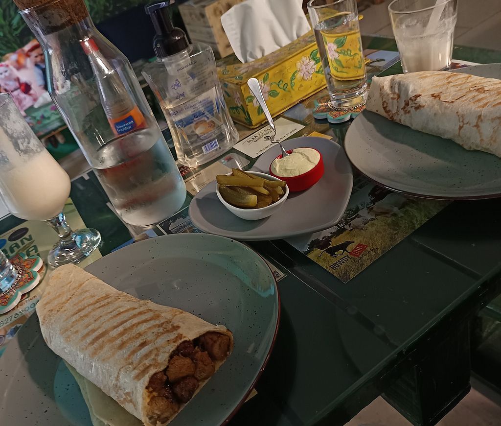 Sara tried to warn us how large the portions were, but we underestimated her. We had the zinger and the shawarma, and that gave us enough leftovers for the bus to Petra for the next day, and breakfast before 22km of hiking in Petra, which was an absolute lifesaver as our hotel's understanding of vegan food left us with some fruit and cucumber. The wraps keep surprisingly well out of the fridge and are packed with protein. The restaurant is very happy to provide take away containers as needed.