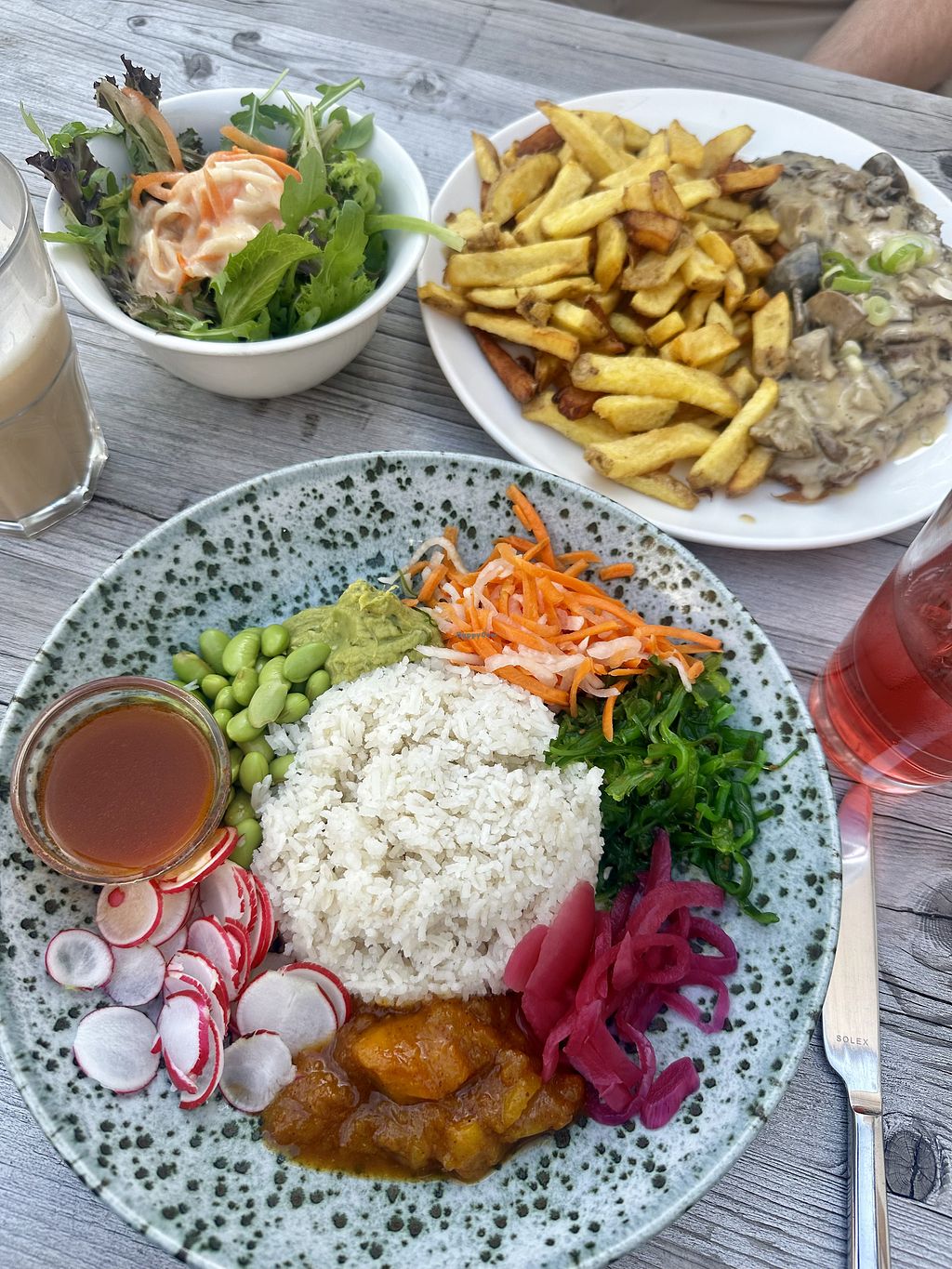 We ate the peanut curry (good) and falafel bowl (super good), and the tiramisu (delicious). The service was great and the drinks were good too. The place next door was plating really good music too. It was a vibe.