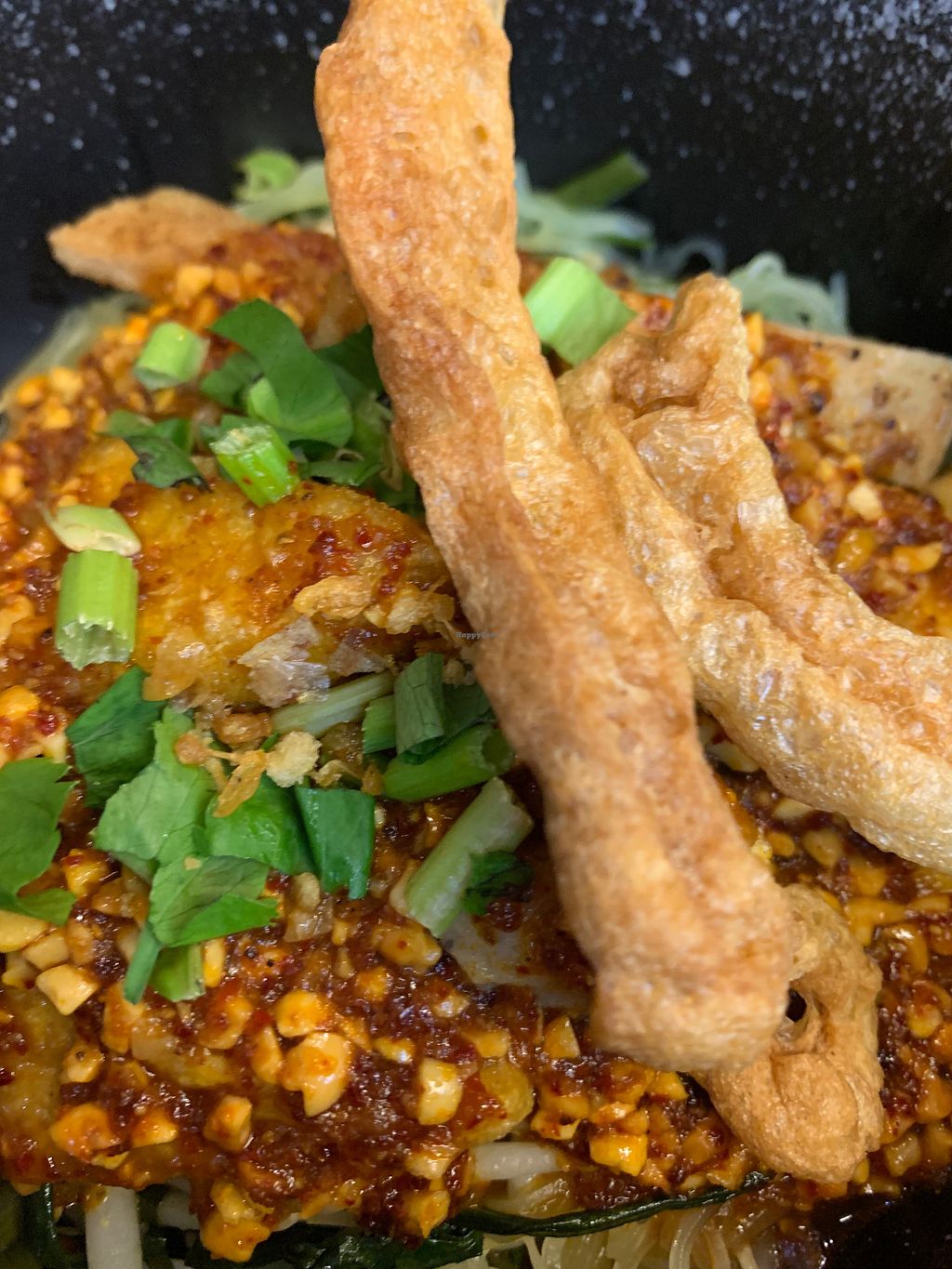 Uncomfortable that this place has Vegan in the name but lots of dishes are only vegetarian. Also, the vegan options were not all marked clearly. Had the crispy papaya salad and asked for "less spicy" but was still too hot to finish. Satay was quite plain. My partner had the mushroom duck which he said was fine but lacked flavour. Thai tea and pea flower lemonade were both great!! But disappointing they come in single-use plastic even when you eat in. Free popcorn if you write a Google review, but they wanted to see the review, take a photo of it, and then take a photo of us!! Wouldn't rush back.