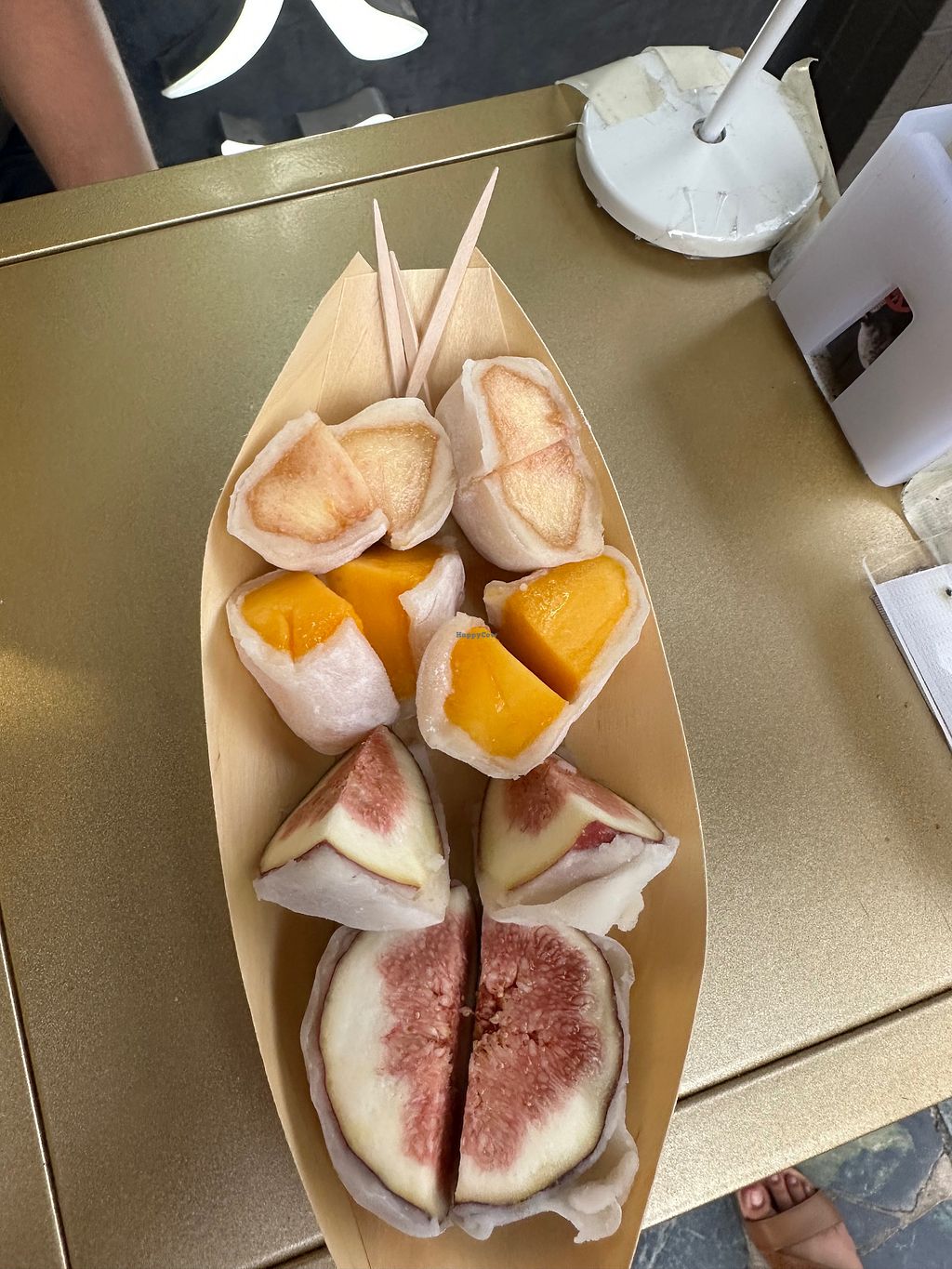Clearly labelled vegan mochi with fresh fruit inside, instead of a paste or ice cream. The fruit is perfectly ripe and gives a very different experience. They also have other flavours. Definitely worth a try, even if a bit on the pricey side.