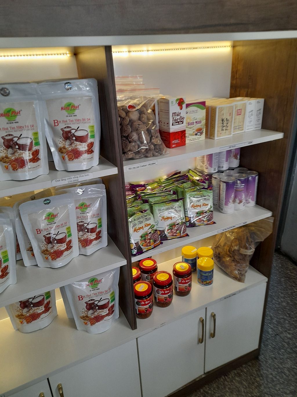 Has a few shelves selling a few vegan products.