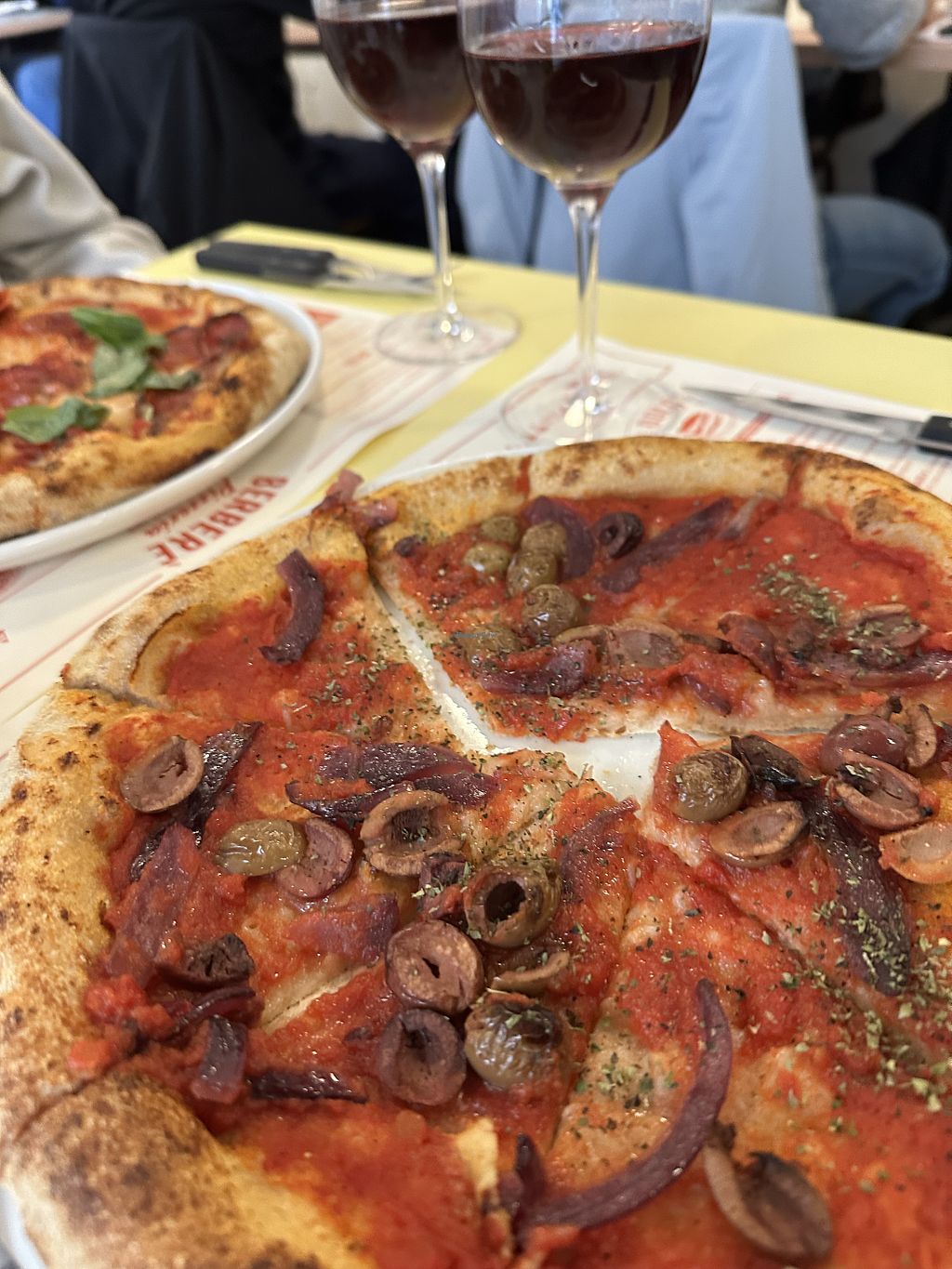 The pizza was delicious. There wasn't a vegan option on the menu initially, so we inquired. We were informed that the vegan hummus pizza is only available in the summer menu, with no labeled vegan options in the winter menu. However, they were willing to veganize three or four pizzas, including the vegan Mediterrana with onions and olives, which turned out to be very tasty. It ended up being the most delicious pizza we had in Florence.