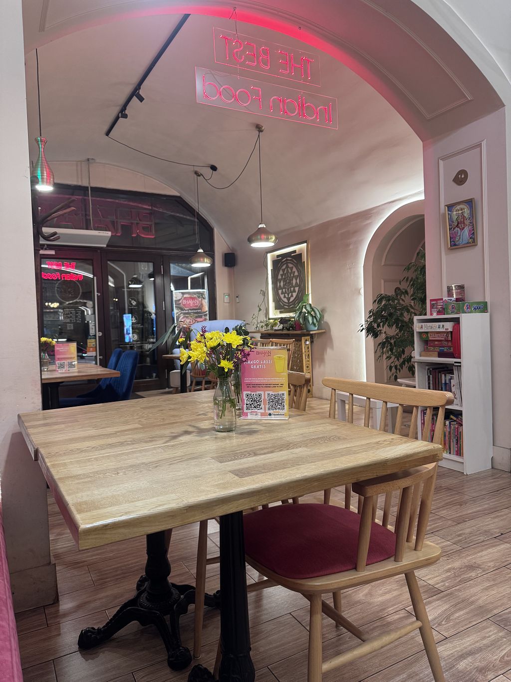 Pros: Great taste, Vegan naan and lassi, Cosy seating